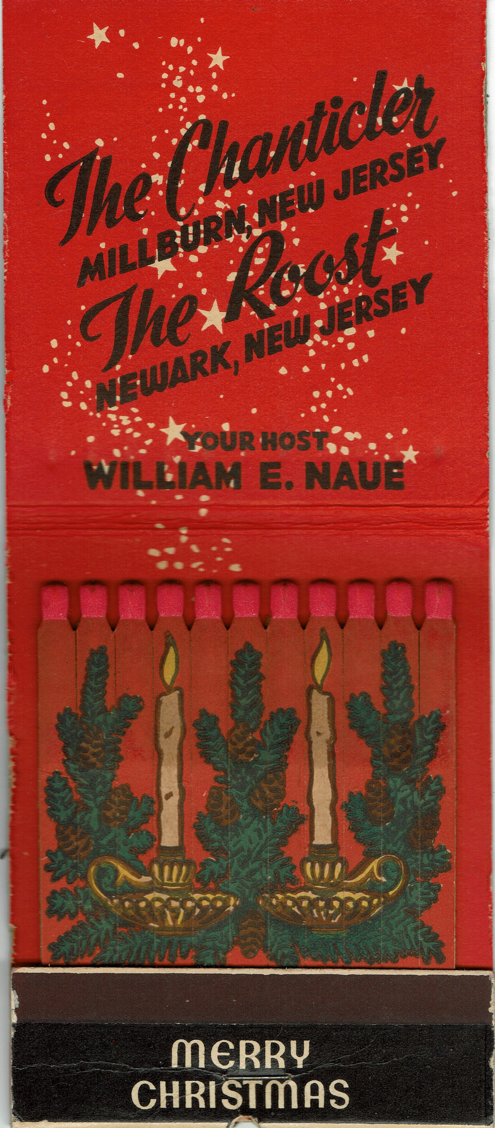 Chanticler Holiday Matchbook.. Outside says Happy New Year and has a candle placed in a wreath and Santas Claus above the words "close cover before striking" and "Merry Christmas". The inside says "The Chanticler Millburn, New Jersey The Roost Newark, New Jersey Your host William E. Naue". 11 full matches. Candle designs on the matches.