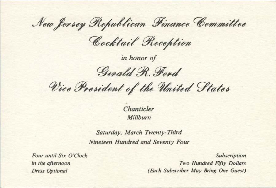 This is an invitation to attend a cocktail reception in honor of Vice President Gerald Ford, at the Chanticler, on March 23, 1974. The "subscription" price was $250 and "Each subscriber may bring one guest." The invitation was sent by the New Jersey Republican Finance Committee and it appears to be unused. On the back of the invitation is stamped "No. 1150." Purchased on eBay from "Kawalec" (?); Box 4281; Clifton NJ 07012.Acquisition