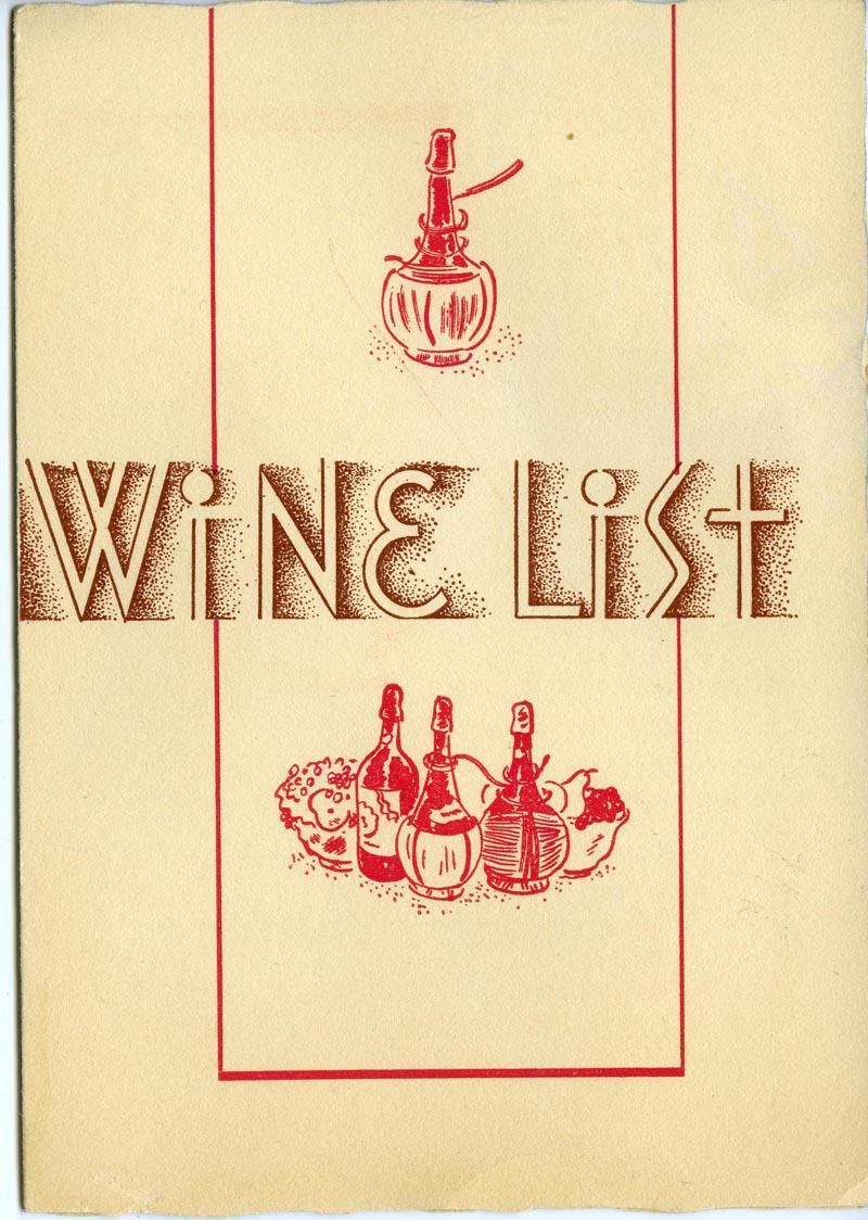 Wine list from Chanticler in Millburn from 1930's. Purchased on Ebay. Cover of four page, single sheet, folded item says only, "Wine List" with sketches of wine bottles above and below writing. Inside left and right are lists of wines and champagnes. Back page with Chanticler name and minimum charges for service. Wine list with some mild fading and small 0.5" crease on all pages approx. 1.75" from top on right side.Acquisition