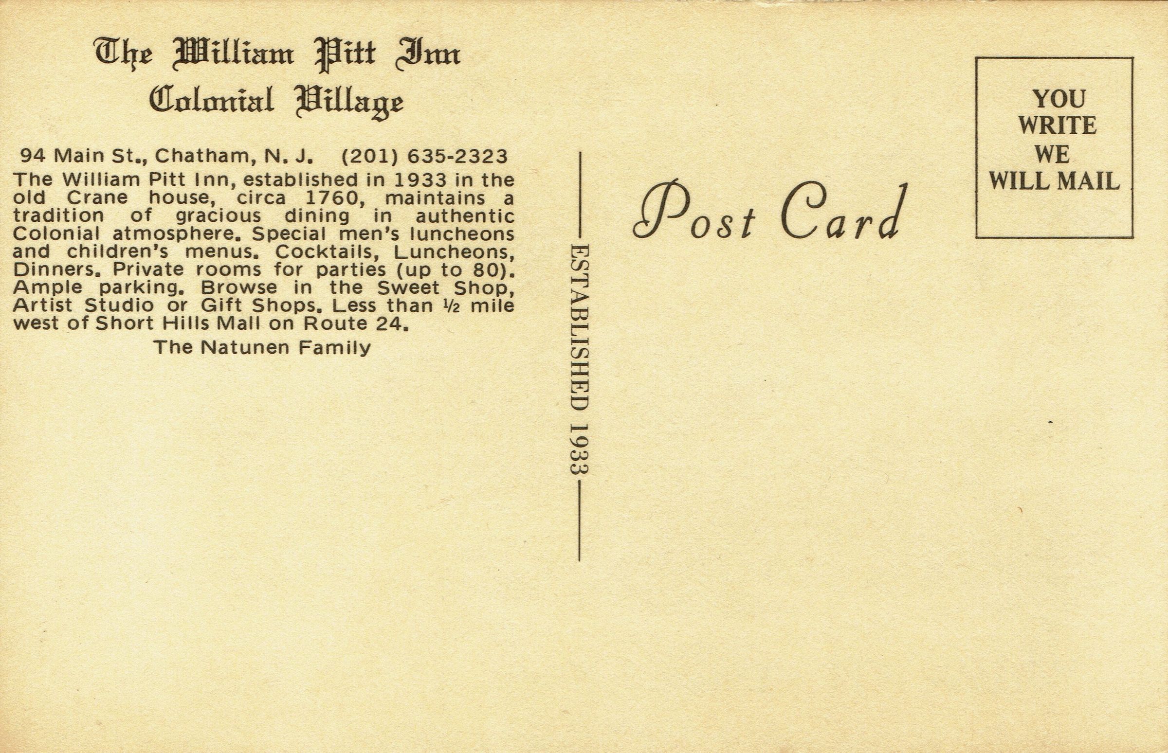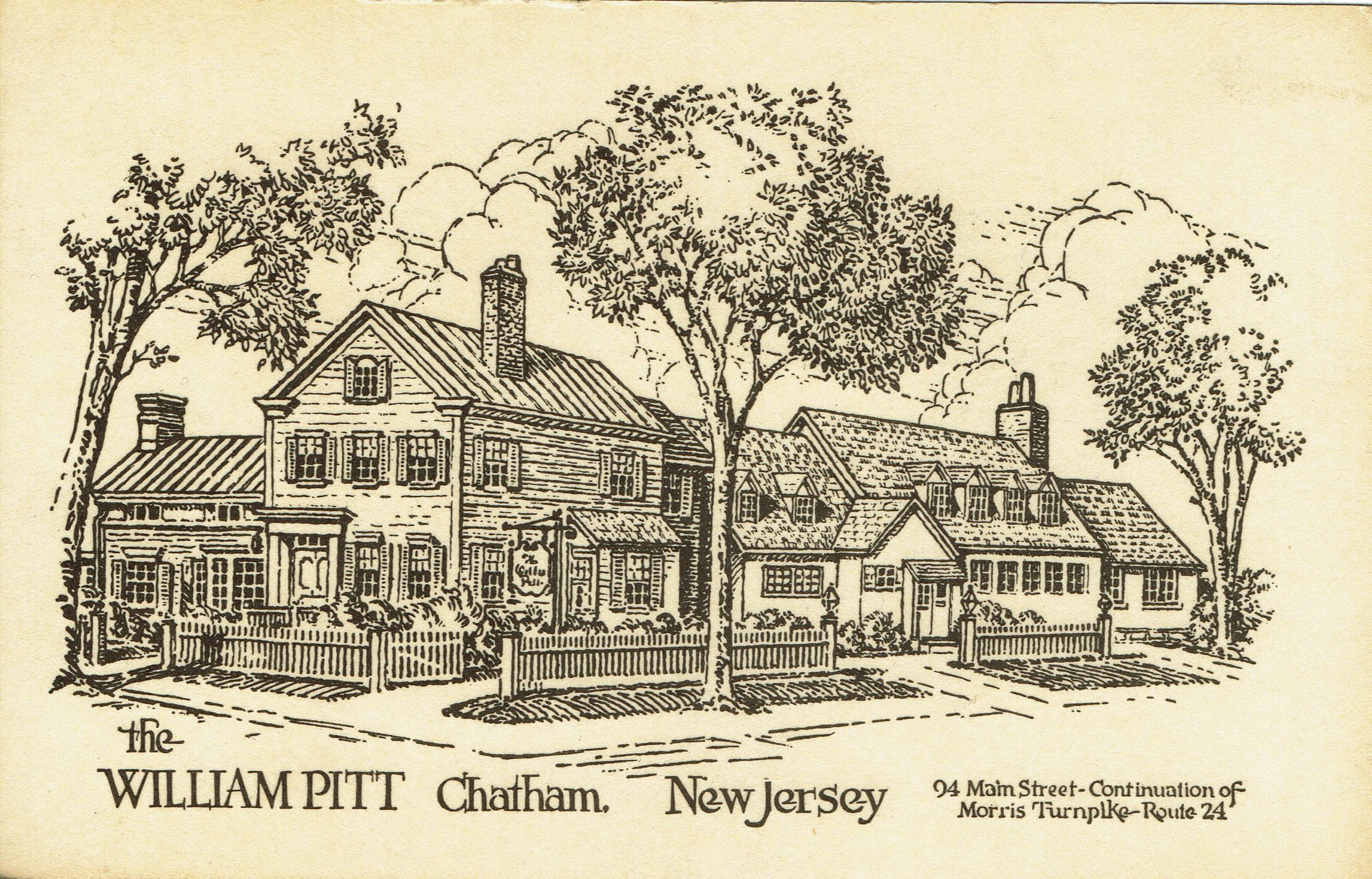 Postally unused postcard of the William Pitt Inn, 94 Main Street, Chatham, N.J., established in 1933.Collection