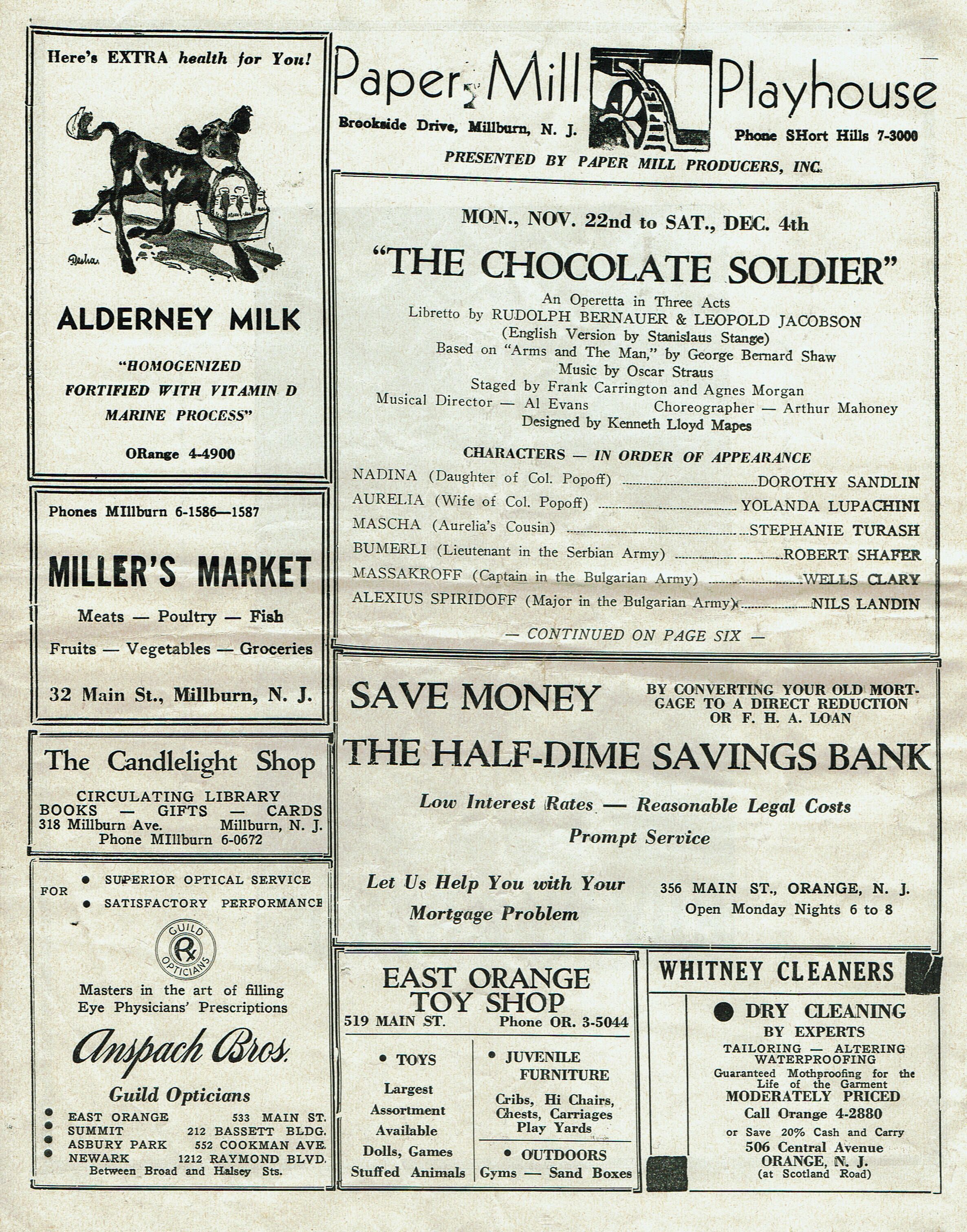 Paper Mill Playhouse Program for The Chocolate Solider, November 22-December 4, 1943 with Dorothy Sandlin, Yolanda Lupachini and Robert Shaper. 8 pages, illustrated with B&W advertisements to local businesses.Collection
