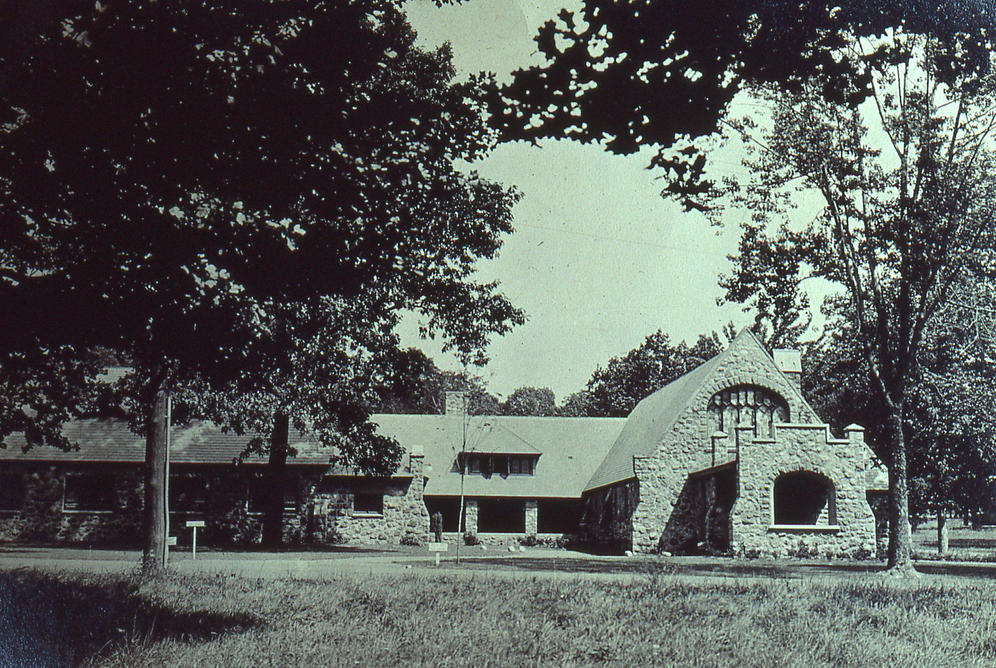 Photograph of Christ Church after the 1916 additions looking into the area between the church and guild hall also showing the cloisters. Owen Lampe slide taken from the Christ Church Archives in May 1981.Photograph Details