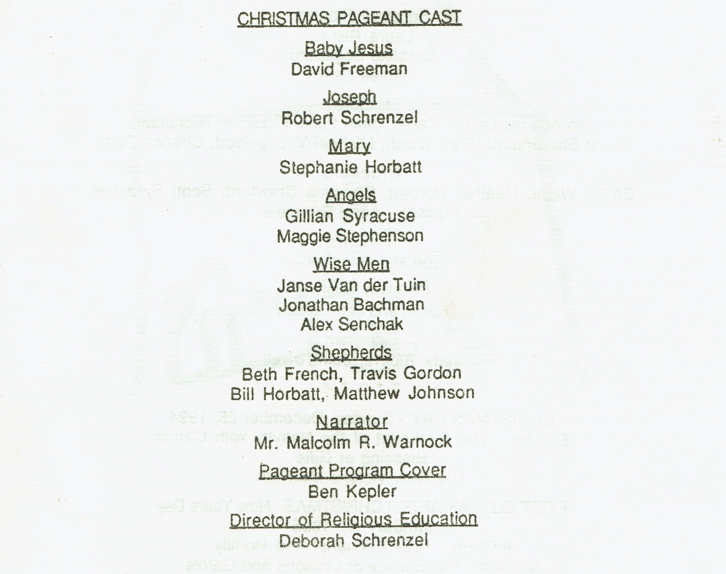 Photograph of the cast of the 1994 Christ Church Christmas Pageant. Cast members were: David Freeman, Robert Schrenzel, Stephanie Horbatt, Gillian Syracuse, Maggie Stephenson, Janse Van der Tuin, Jonathan Bachman, Alex Senchak, Beth French, Travis Gordon, Bill Horbat and Matthew Johnson. Narrator was Malcolm R. Warnock.Collection