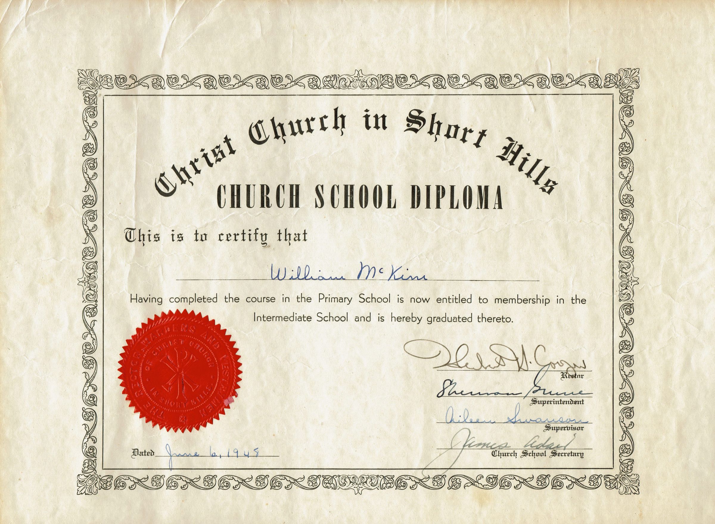 Church School Diploma for William McKim from Christ Church, Short Hills dated June 6, 1948.Acquisition