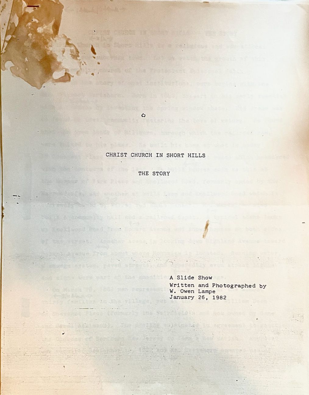 Nonfiction story that describes the creation and development of Christ Church. It was written by W. Owen Lampe on January 26, 1982. The church was made possible by Stewart Hartshorn's donations. The text has arrows and numbers written in it to show the movement of the slideshow.Acquisition