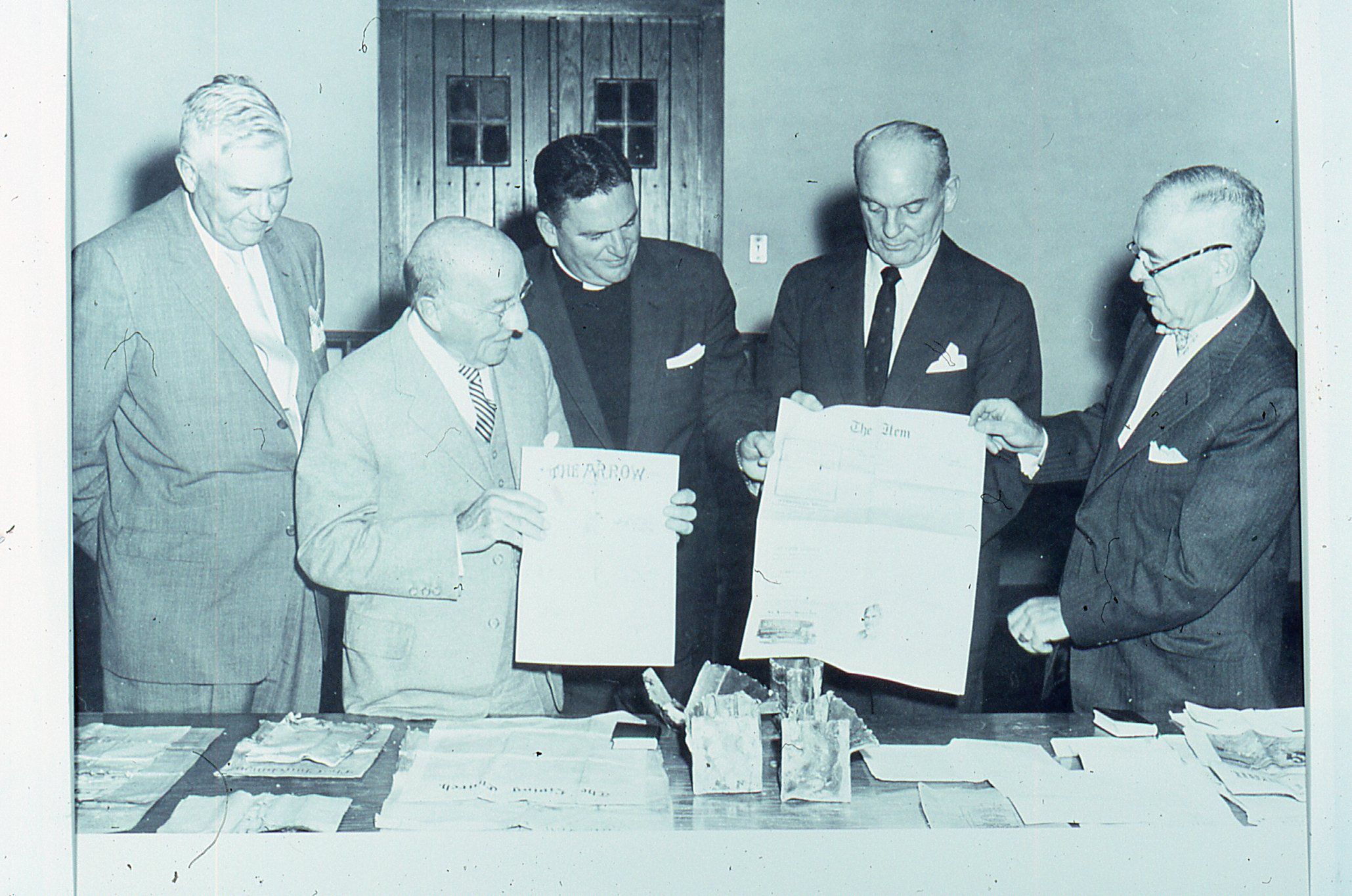 Photograph of the opening of the Christ Church archive from the 1883 cornerstone in 1957. Owen Lampe slide from the Christ Church archives.Photograph Details