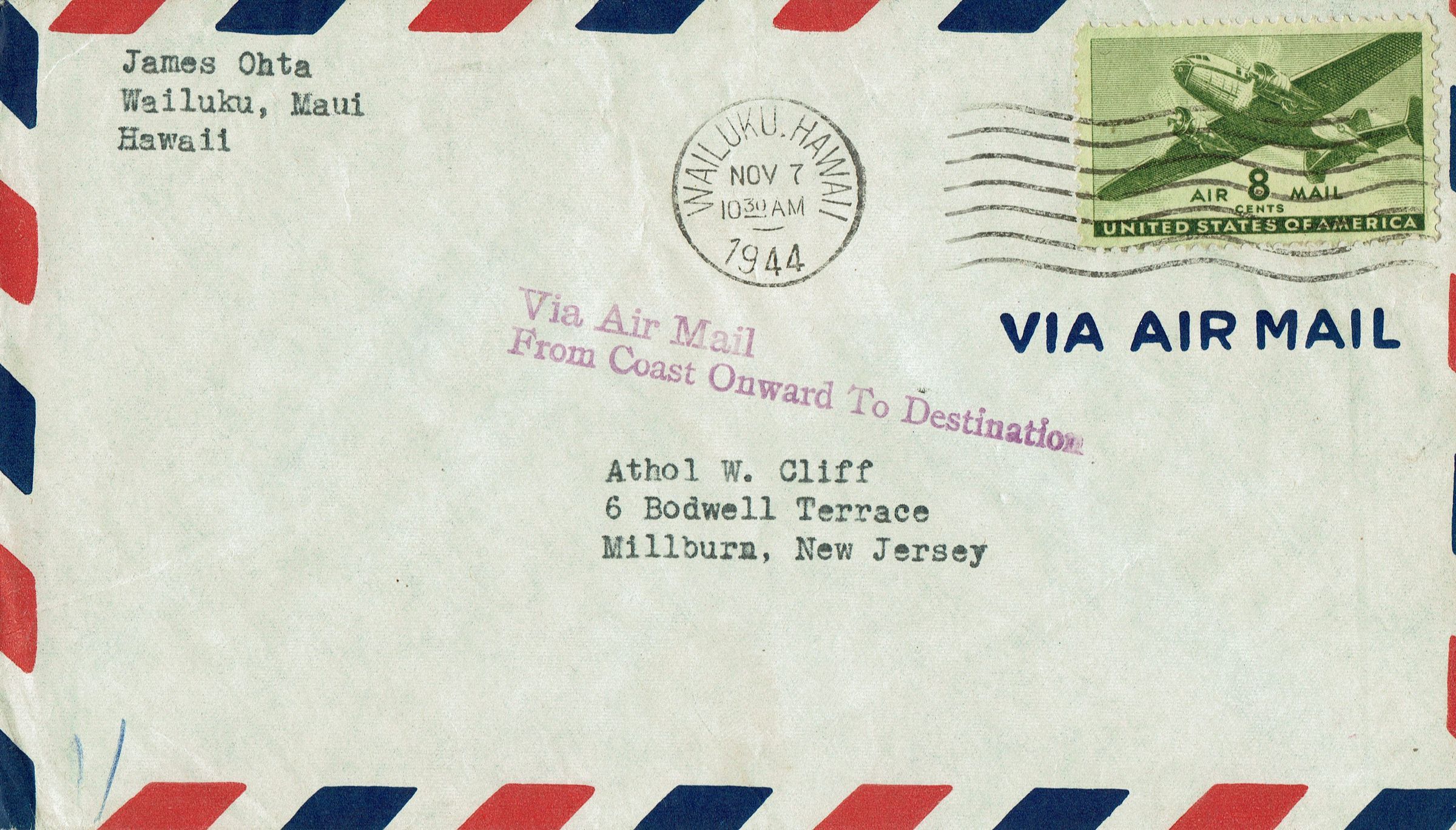 Envelope addressed to Athol W. Cliff, 6 Bodwell Terrace, Millburn, New Jersey mailed from James Ohta, Wailuku, Maui, Hawaii November 7, 1944.Acquisition