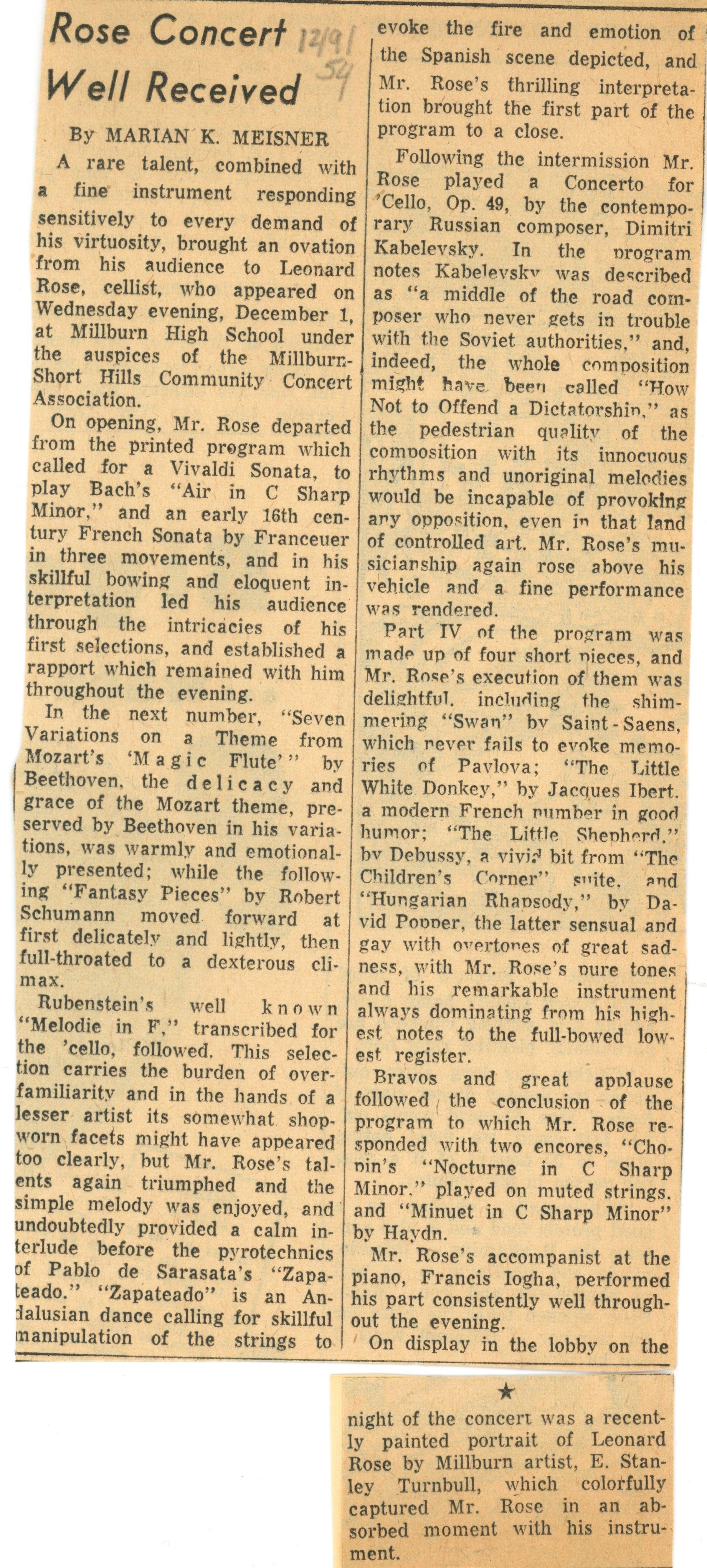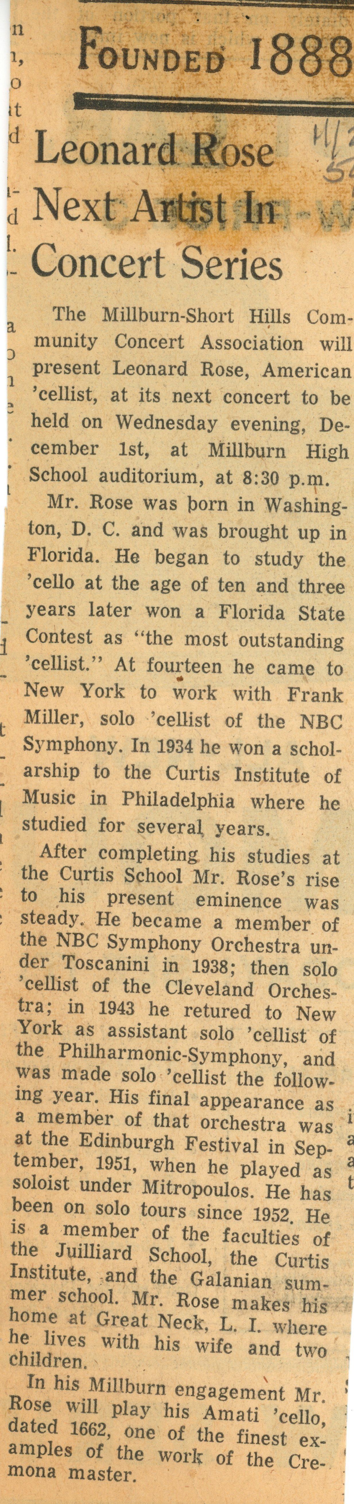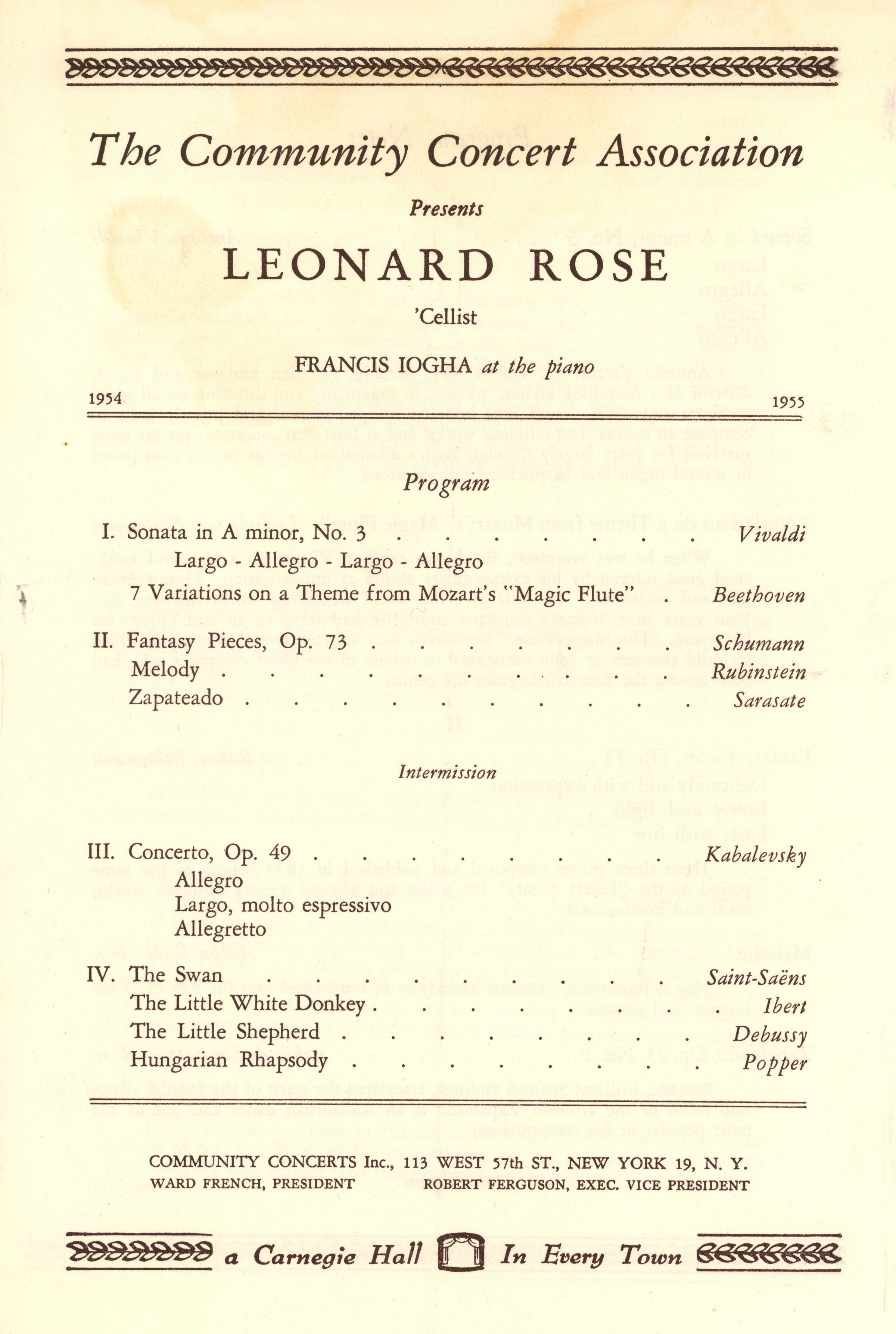 Community Concert Association: Leonard Rose Program and Articles, 1954