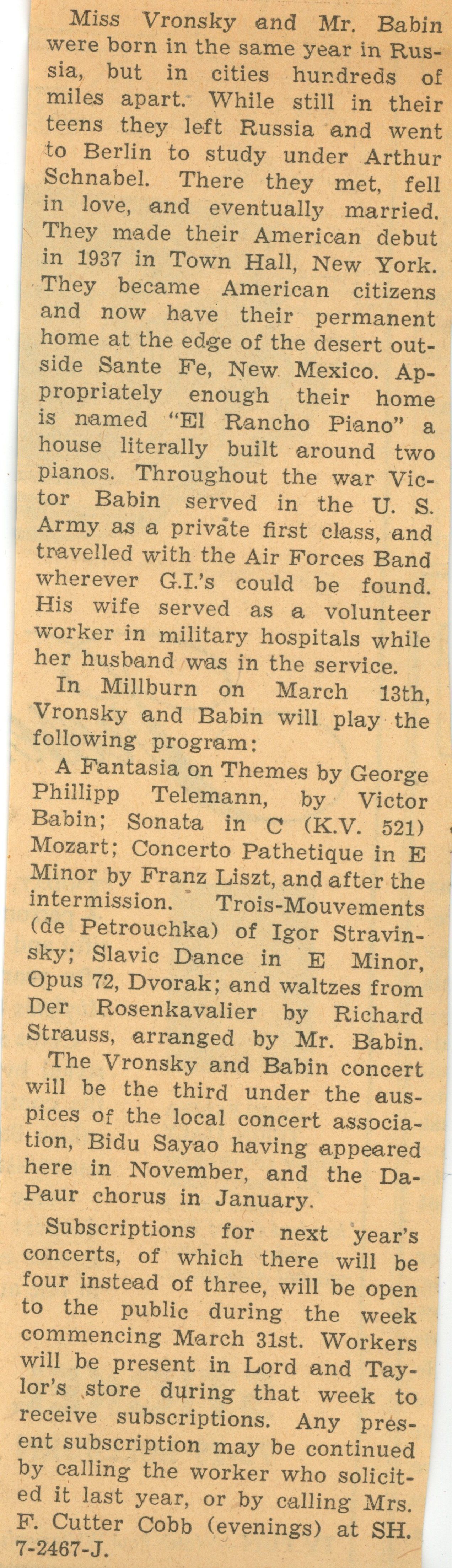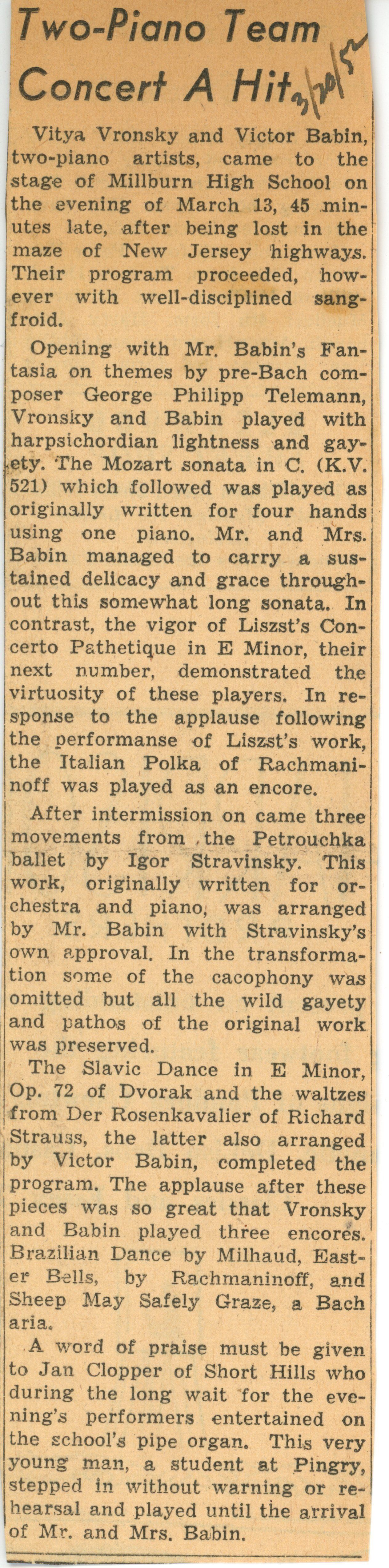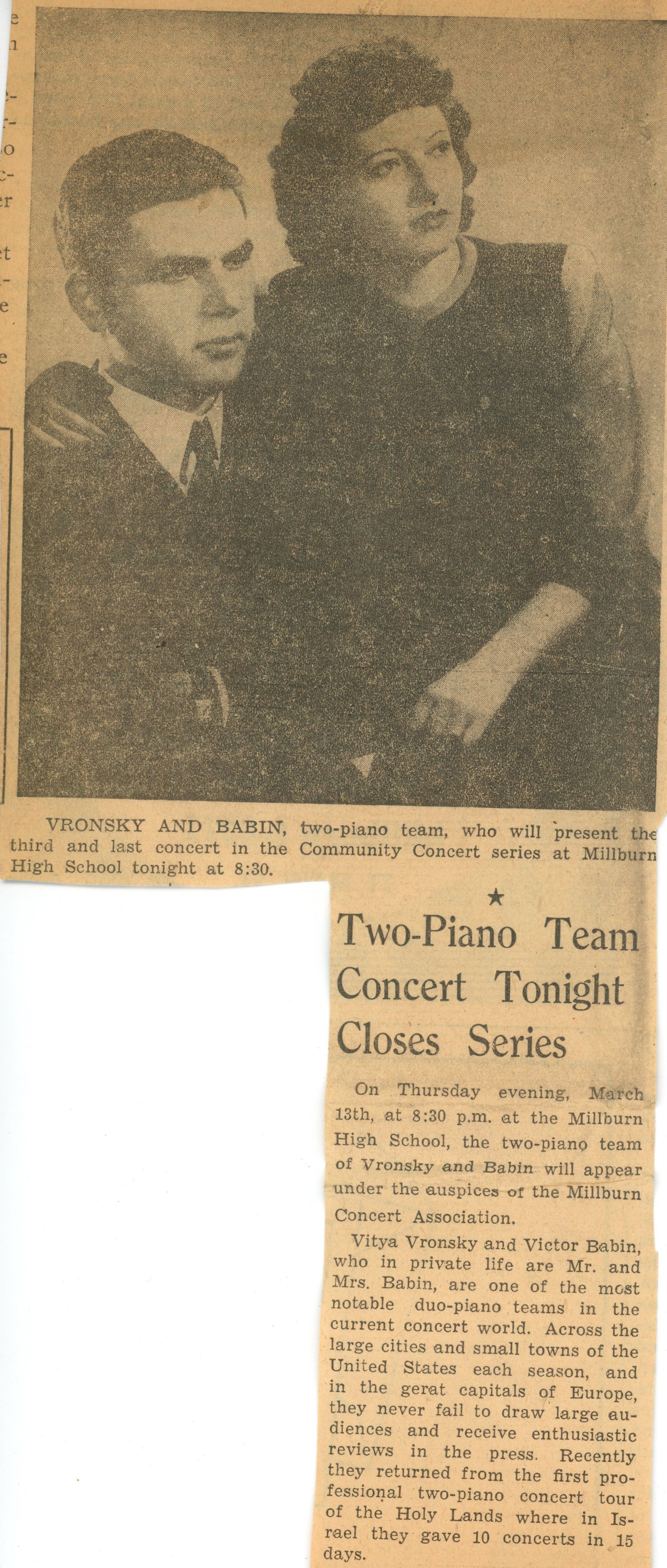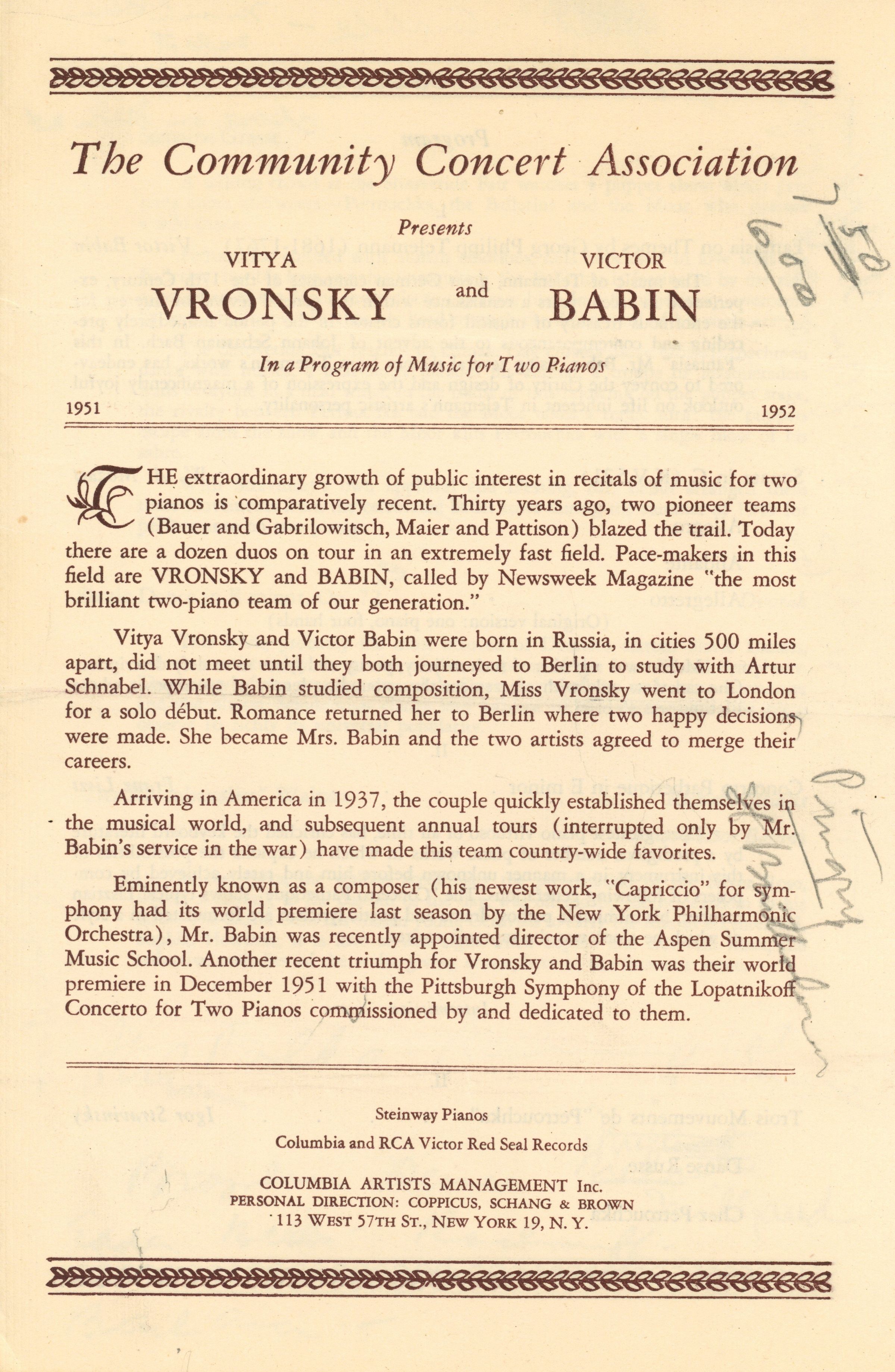Community Concert Association: Vronsky and Babin Concert Program and Reviews, 1952
