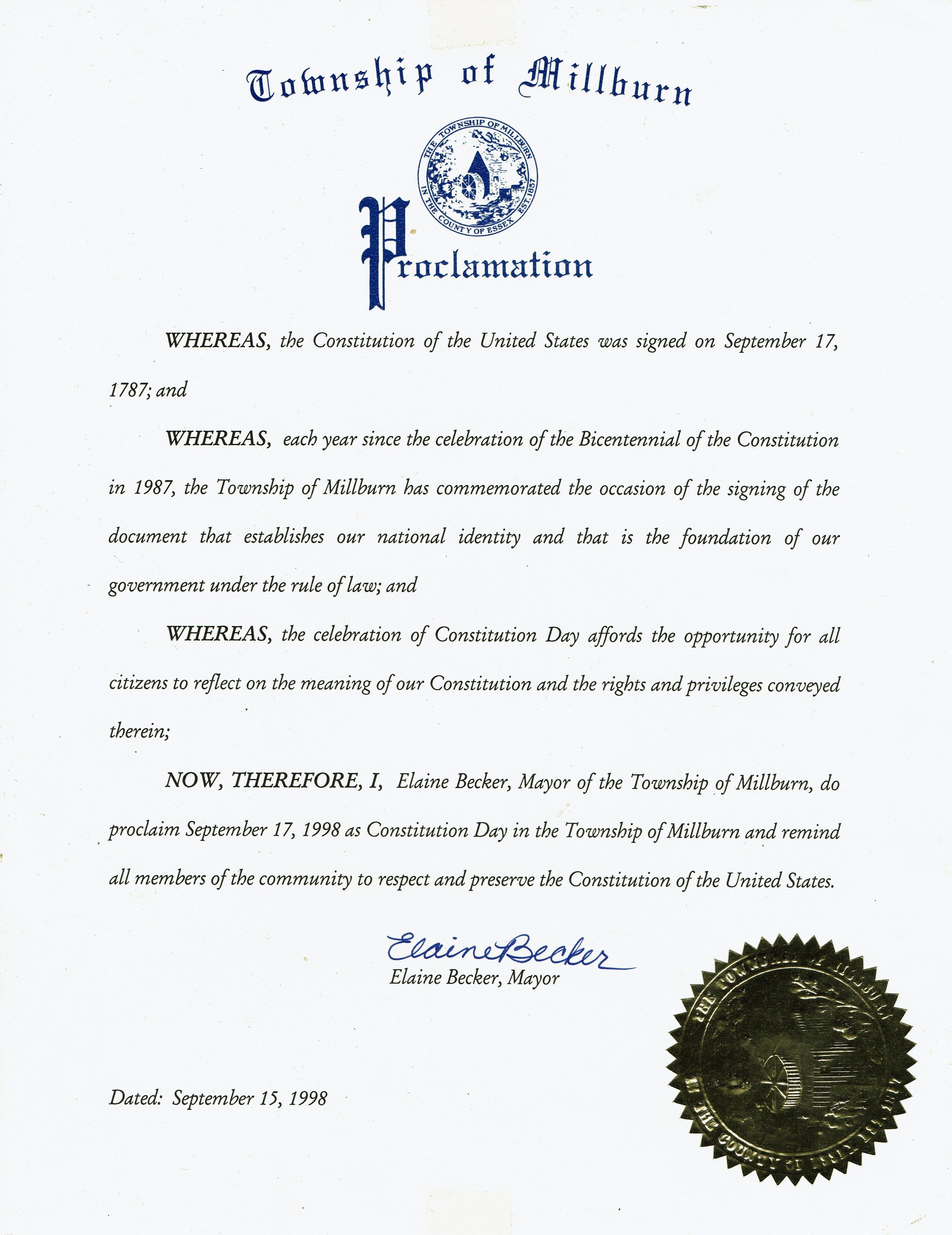 Proclamation signed by Millburn Township Mayor Elaine Becker on September 15, 1998, proclaiming September 17, 1998 as Constitution Day in the Township of Millburn. There were several events around town honoring the Bicentennial of the United States Constitution.Acquisition