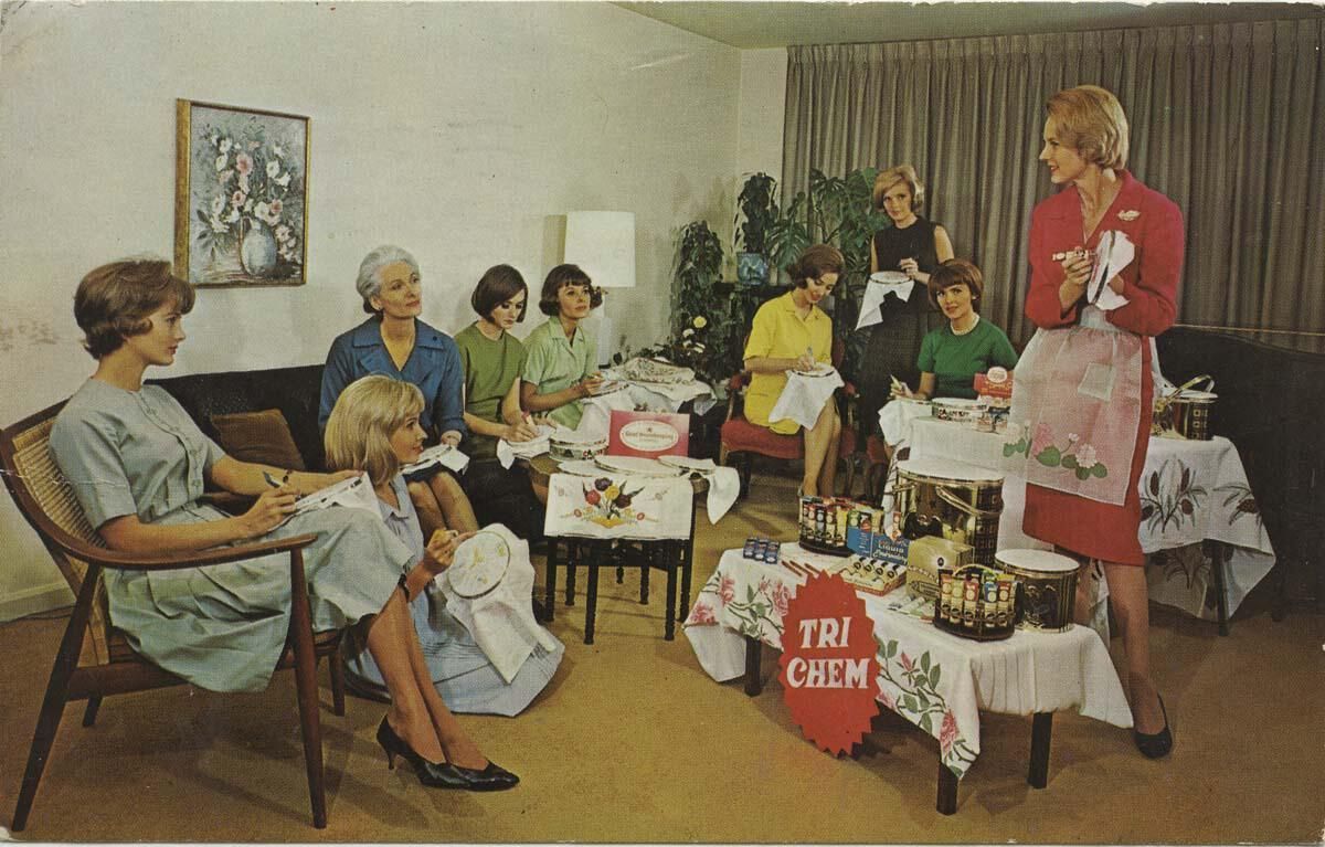 1969 advertising postcard for Tri-Chem embroidery paints, from Corwood Sales, 41 East Willow St, Millburn NJ. The glossy, color-photo postcard features an in-home demonstration of Tri-Chem embroidery paints, to a gathering of women with embroidery hoops prepared with a textile to be painted. The card was sent to Virginia Hargash(?) of Post Brook Rd S. in West Milford NJ 07405 and has a "Del. Date" (Delivery Date?) of Aug. 18, 1969 for an amount of $62.05. The card has edgewear, bumped corners, and slight yellowing on the address side. Purchased on eBay from Crow's Nest POstcards; 6303 Thornburgh Ct.; Foresthill CA 95631, for $7.50 plus $0.99 s/h.Acquisition