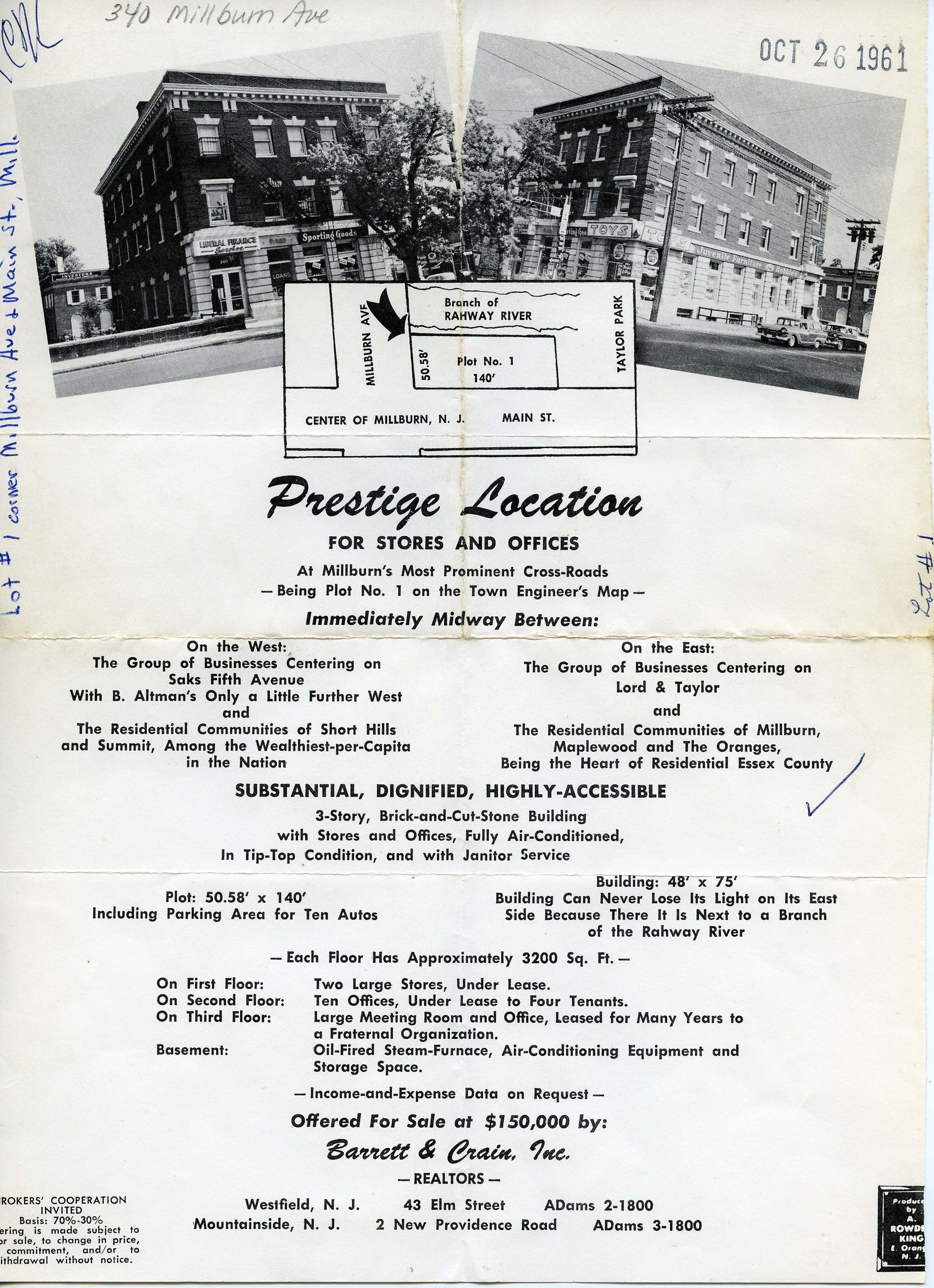Advertisement for sale of 340 Millburn Avenue building, former site of National Bank, from October 26, 1961.