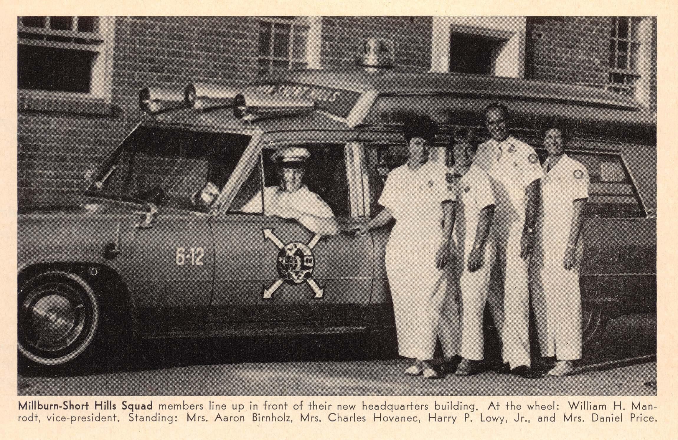 Efforts to organize a First Aid squad for Millburn-Short Hills began in 1957. The organization, consisting of 35 members, received its NJ charter in 1958 and answered its first call on June 14. Funding for equipment and operating expenses was largely provided through the Short Hills Junior league. In 1962, the squad was able to purchase its first ambulance and in 1967 received a second ambulance from the town.