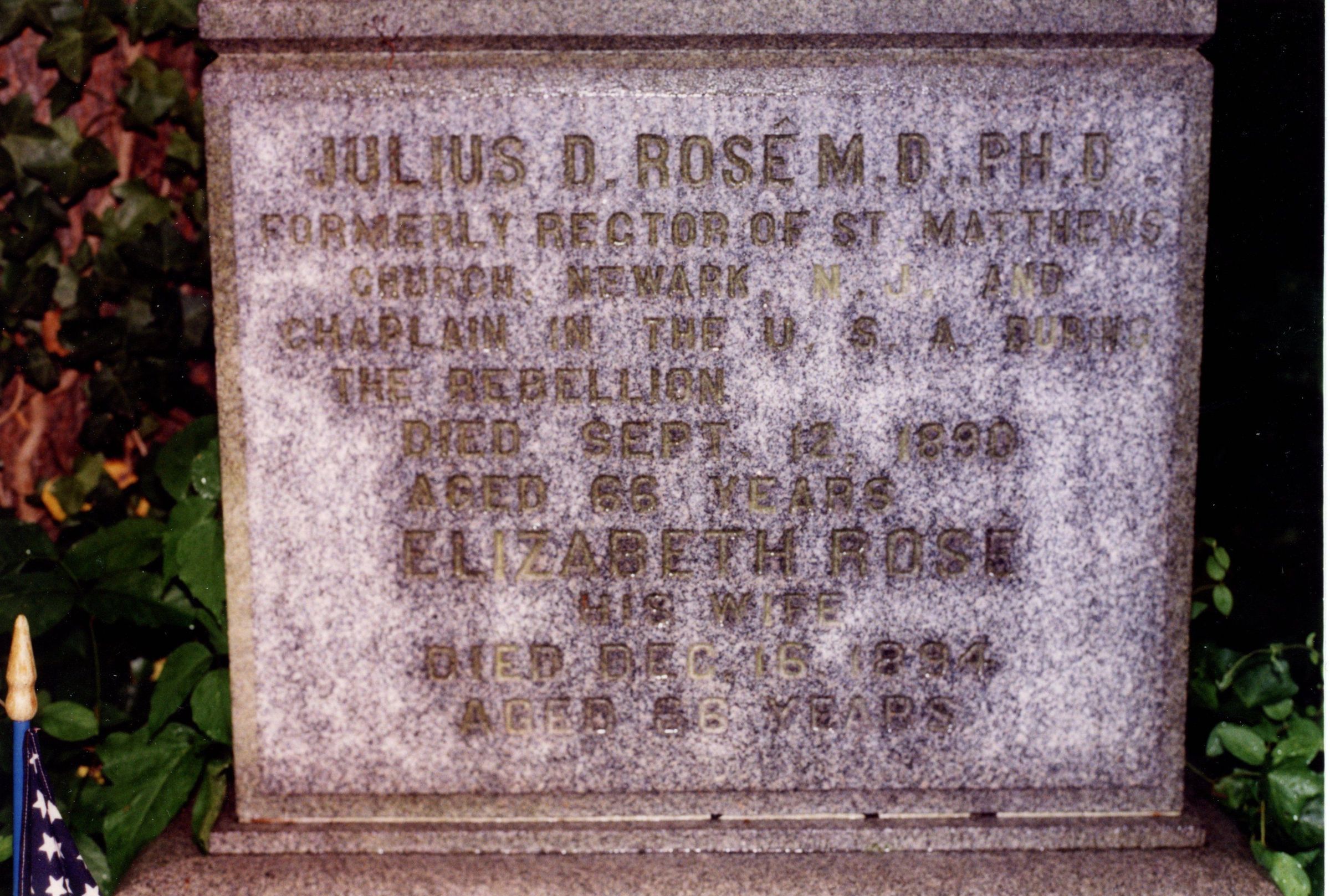 Photographs of Reverend Julius David Julius Rosé's gravestone at St. Stephen's cemetery taken during the Memorial Service on August 7, 1999, honoring the Reverend Julius David, Chaplain of the 7th Regiment New Jersey Volunteer Infantry and founder of "The Mountain School" in Millburn.Photograph Details