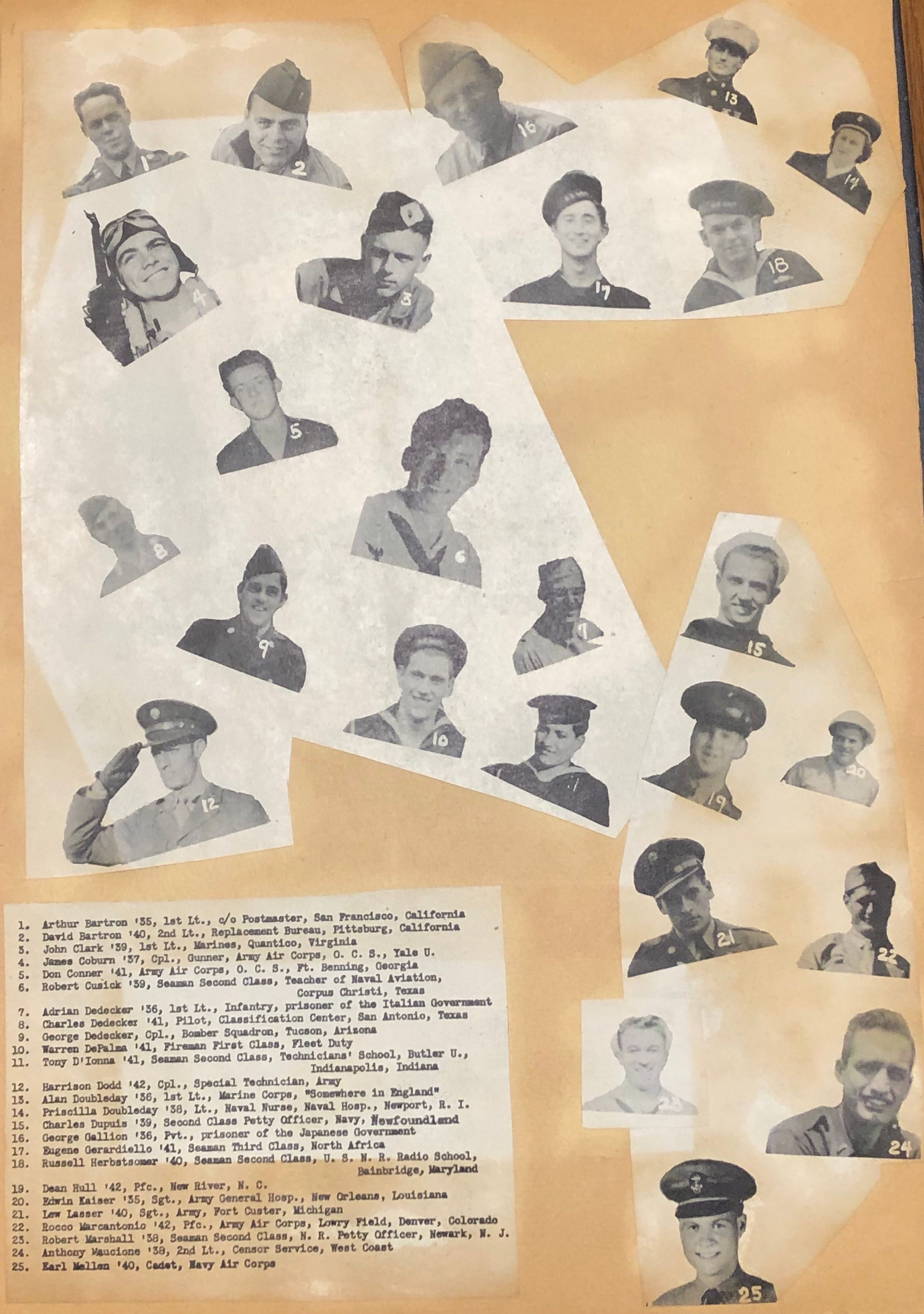 WWII Scrapbook with photograph and newspaper clippings from Margaret Hornecker. Has information on soldiers including Sgt. , Harry Lore, PFC Michael Bufo, Sgt Richard W Sweet Jr, Corporal William Monohan, Sgt. Marvin A Silbersher, Sgt. Mielke, Second Lieutenant Gilbert W Piddington, Lt. Percy Knott Jr, John C Flaherty, Adrian F Dedecker, Lt Percival L Knott Jr, 2nd Lt. Ralph George Almond, Pvt. Geoerge L Gallion, Warren De Palma, First Lt. AL Kahn, and more. Photographs of Carl Berberich, Alex Koschoreck. Sargent H. Norman Hornecker, Bernard C. Hornecker. Thomas and James Ellwanger, Charles, Jack and William Snyder (The Snyder Triplets).Acquisition