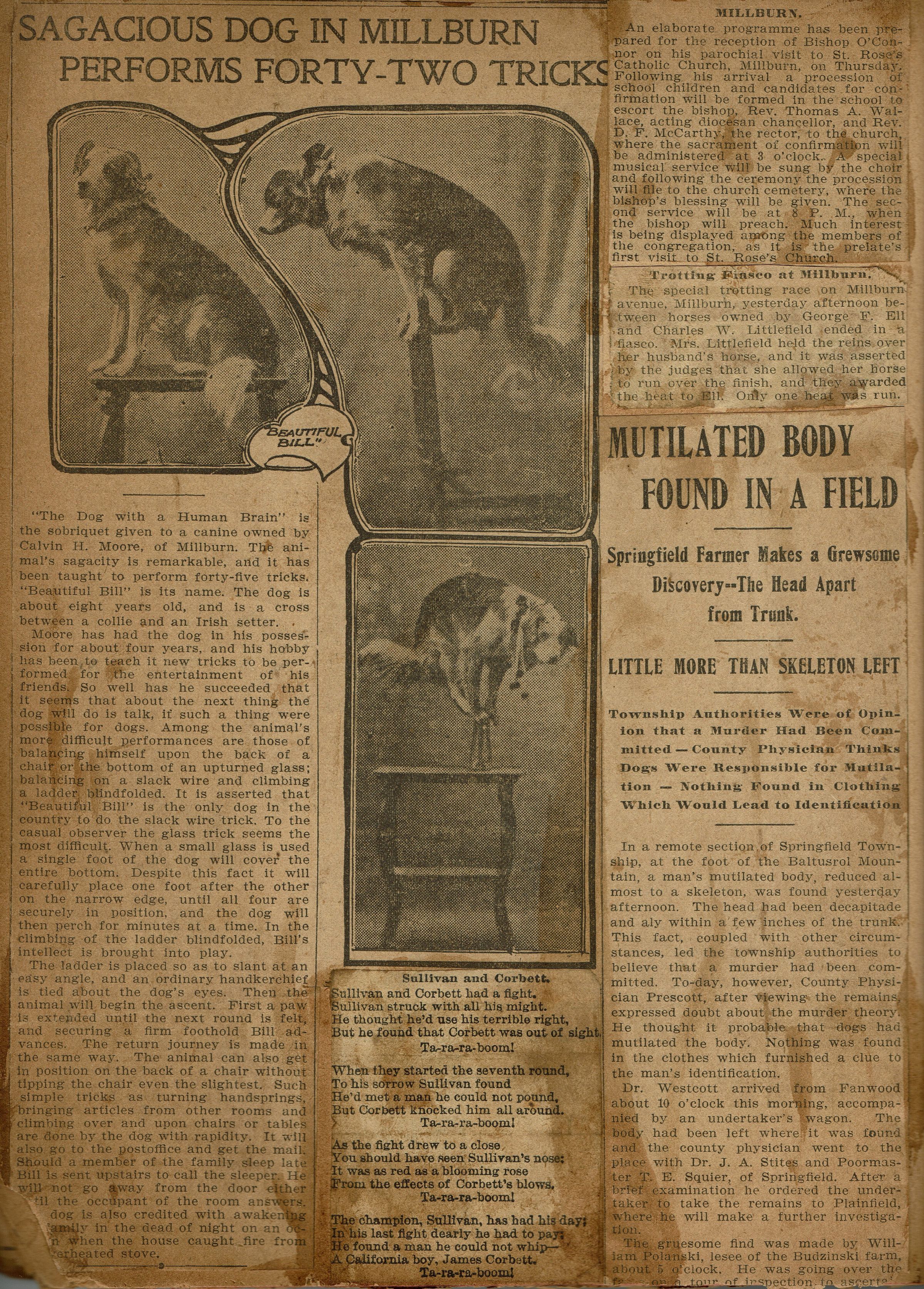 Newspaper clippings from page 32 of the scrapbook belonging to the Flanagan family (44 Mechanic Street, Millburn). Topics include an article entitled "Sagacious Dog in Millburn Performs Forty-Two Tricks" (Newark Evening News, Sunday, August 24, 1902,) describing the 8-year-old Collie and Irish Setter cross named Beautiful Bill, owned by Millburn resident Calvin H. Moore.