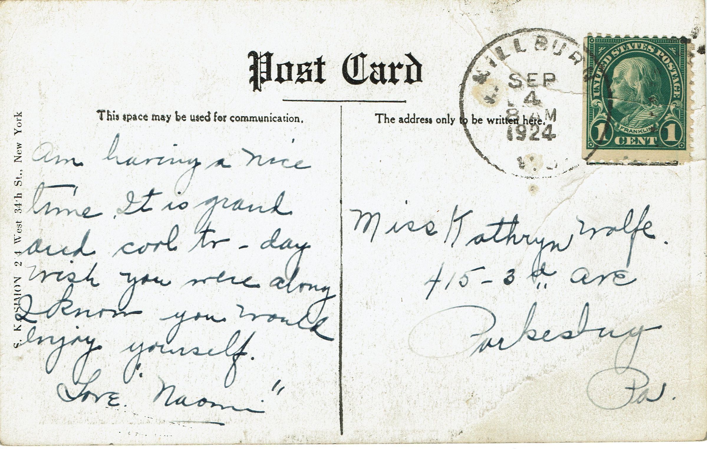 Postally used, postmarked Millburn, September 4, 1924, 8:00 am. Addressed to Miss Kathryn Wolfe, 415-3rd Ave, Parkesburg, Pennsylvania.Collection