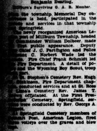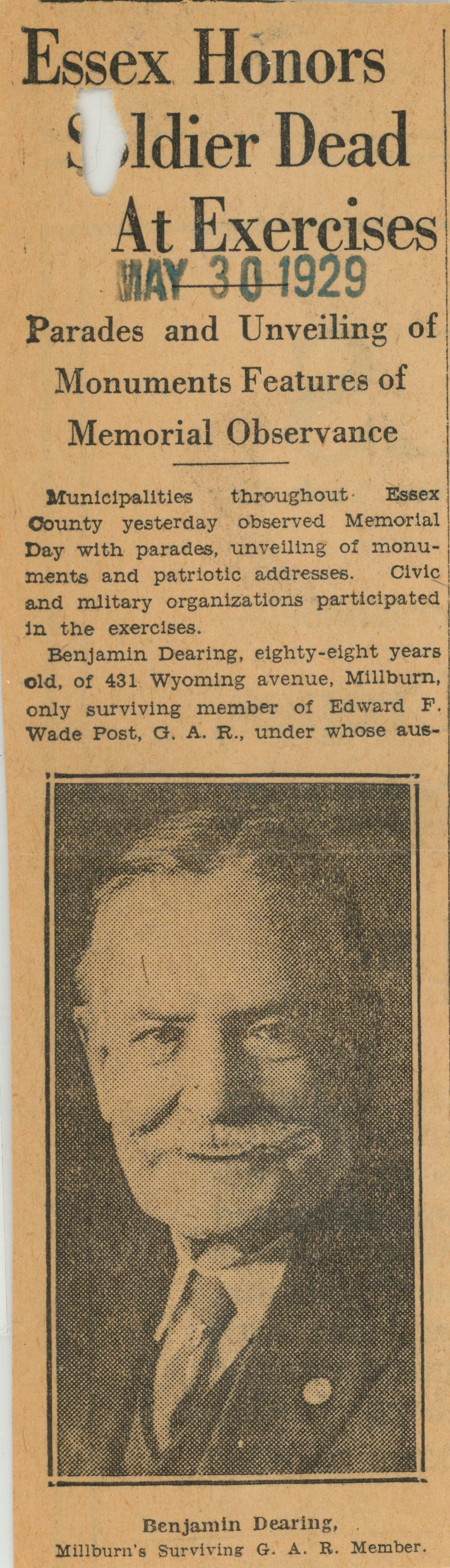 Article for the May 31, 1929 edition of the Newark Evening News," Essex Honors Soldier Dead At Exercises." about Benjamin Dearing, a Millburn Civil War veteran and member of the Edward F. Wade Post, G.A.R.Acquisition
