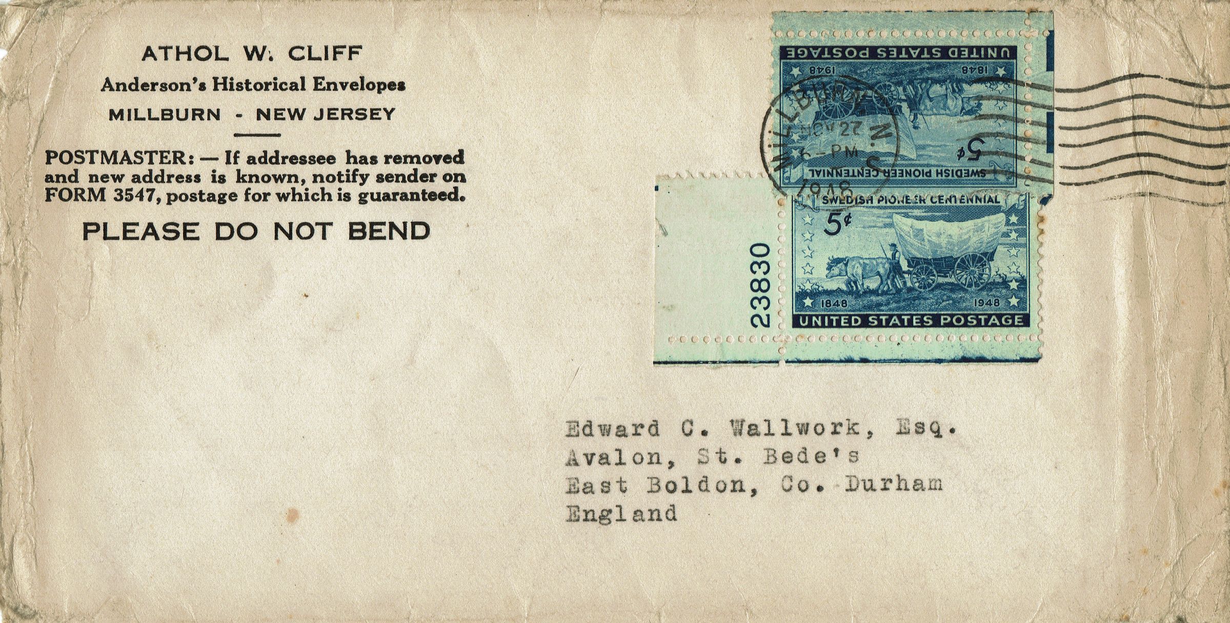 The envelope was acquired along with another envelope sent by Athol W. Cliff on November 27, 1948 to to Edward C. Wallwork in Durham, England.Acquisition