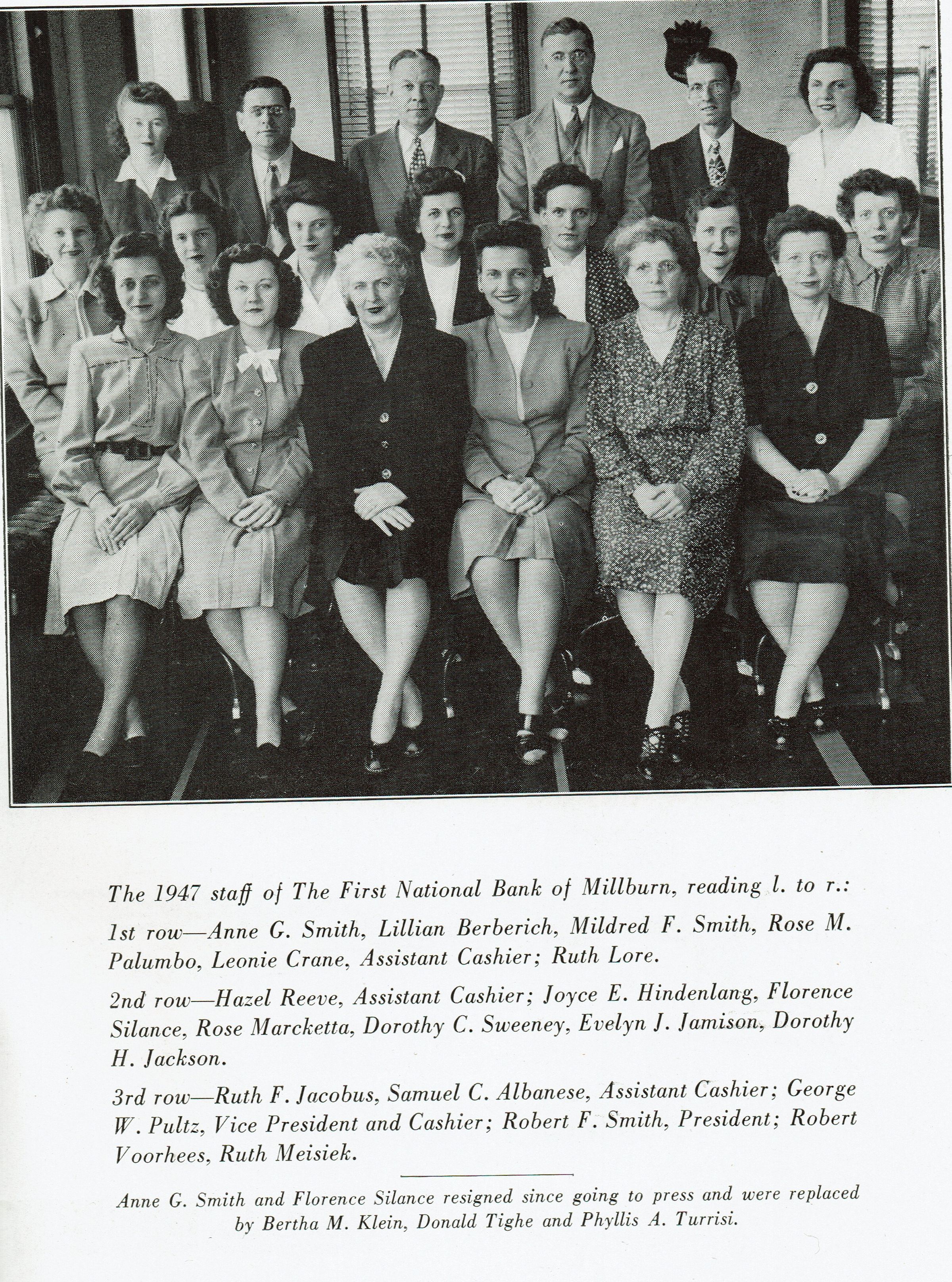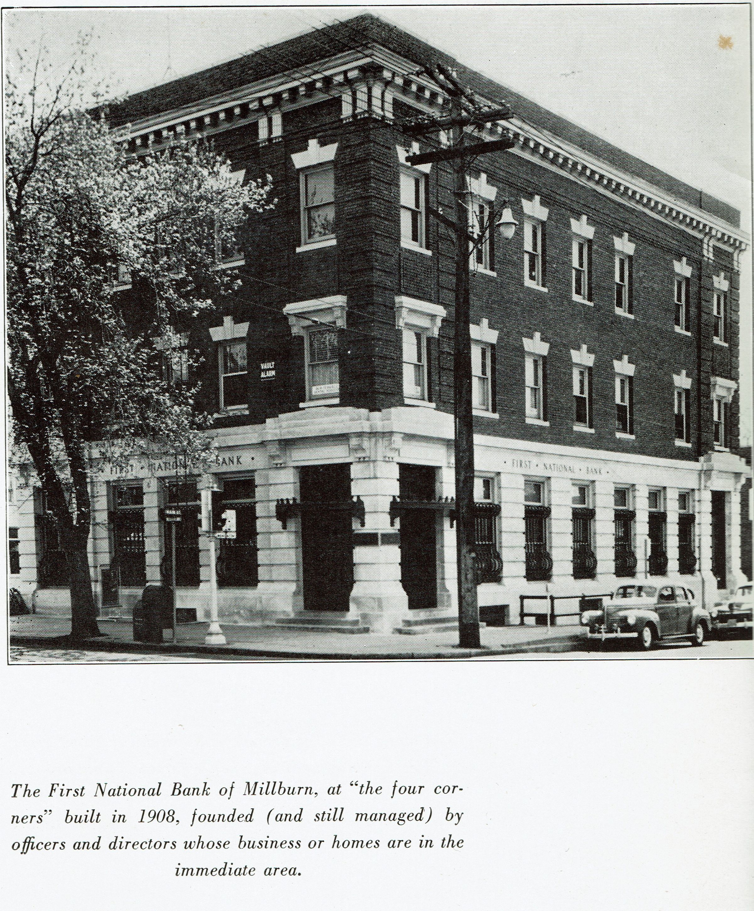 Thirty-four page softcover booklet produced by the First National Bank of Millburn upon the bank's 40th anniversary. The Development of a Community describes the content as "being a brief history of the origin and growth of the area known as Short Hills and Millburn, -- offered as a milestone marking the fortieth Anniversary of the First National Bank of Millburn, with a phrase here and there indicating its complete banking facilities." The cover is yellowed, especially along the edges and the non-glossy, non-photo pages are more lightly yellowed, especially along the edges. Light overall soiling on the cover.