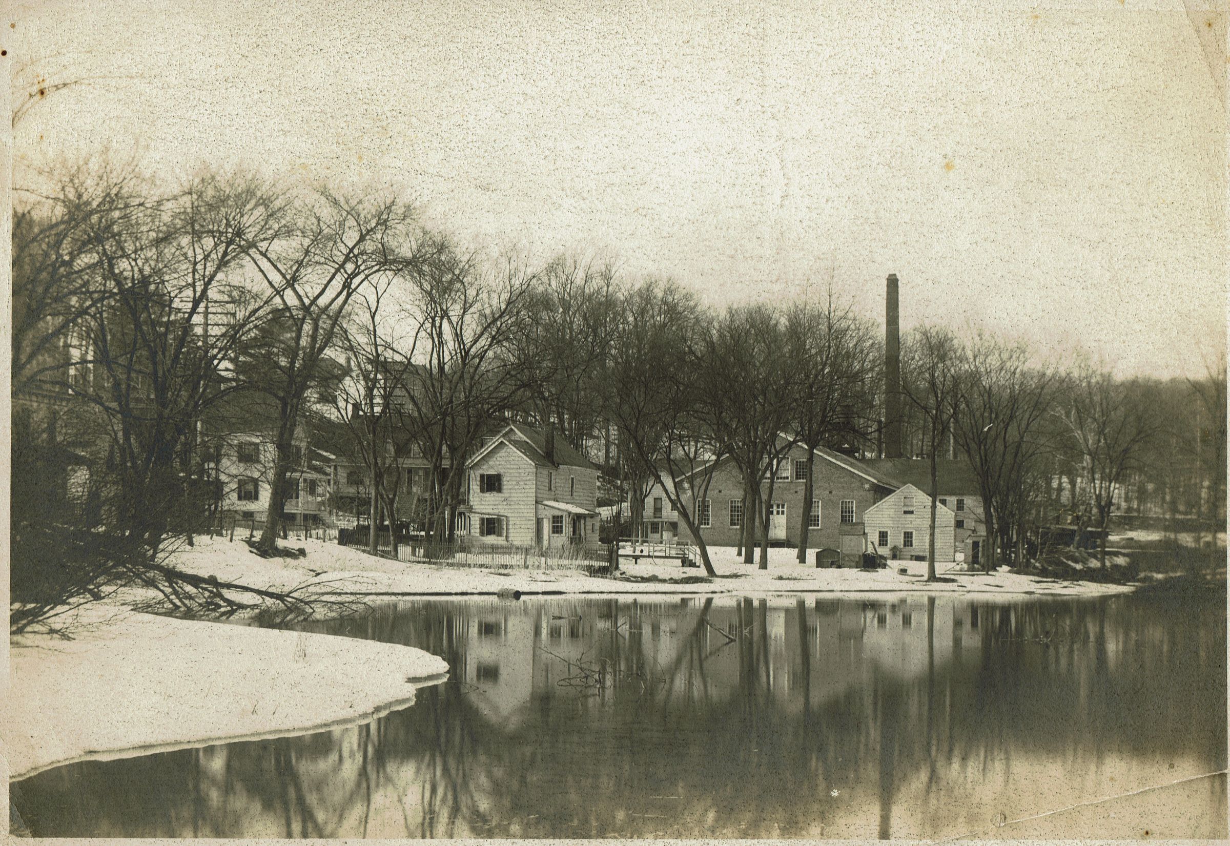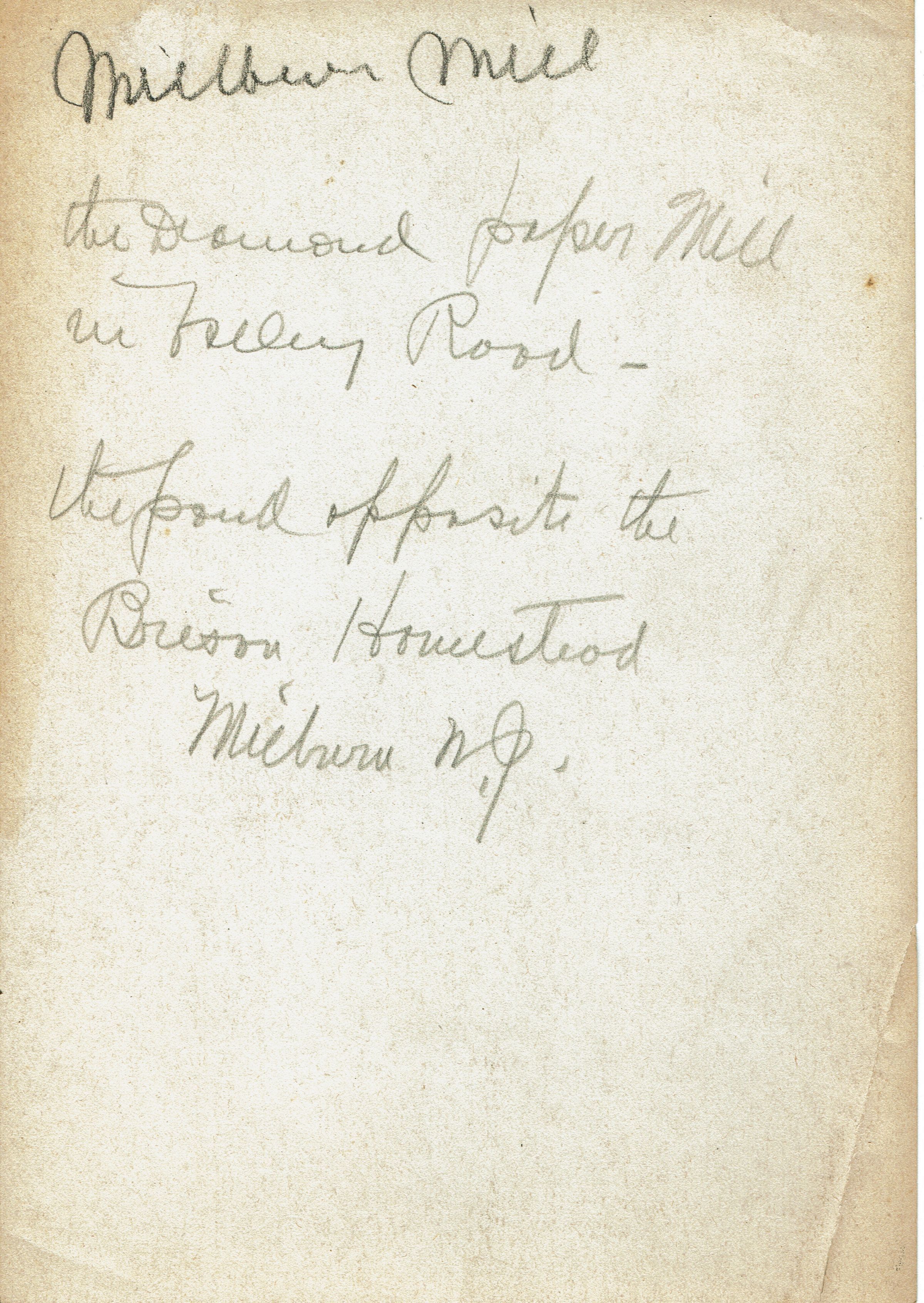 Photograph of the Diamond Paper Mill from the Brison Collection. Inscription on verso of photograph reads: "Millburn Mill. The Diamond Paper Mill on Farley Road. The pond opposite the Brison Homestead."Collection