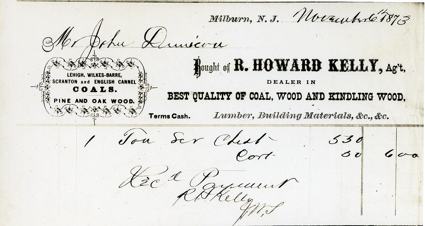 Invoice to John Smith Dunican (December 29, 1833-May 15, 1913) from R. Howard Kelly, agent for One ton of coal cost $5.30, Cartage: $0.70, Total: $6.00 dated "Milburn" Nj, November 6, 1873.Collection