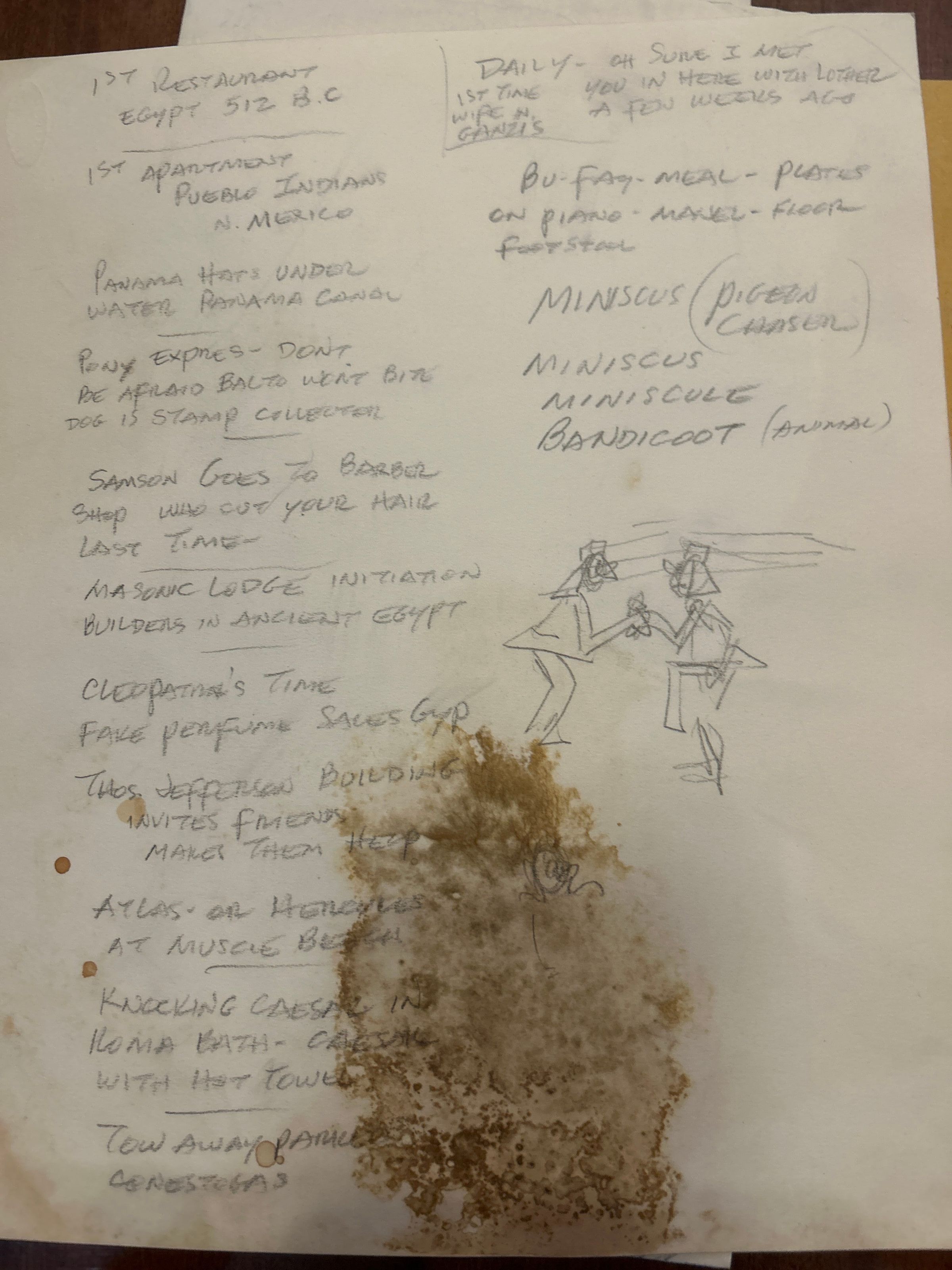 Ideas for cartoons by Bob Dunn written in pencil on card stock paper.Collection