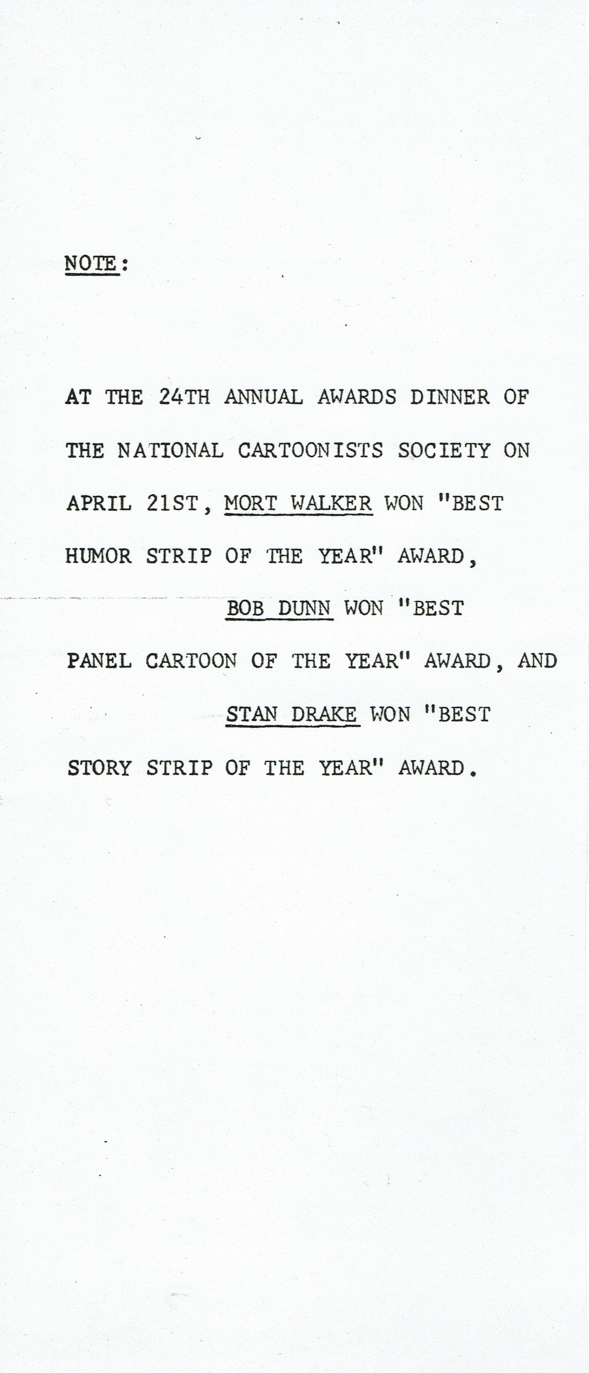 Program of artists in the King Lecture Bureau in 1970-1971, who were available to speak at events. 11 pp. Illustrated with photographs of individuals. Included are: Dan Barry, Jim Bishop, Milton Caniff, Jimmy Cannon, Dr. Lester Coleman, Stan Drake, Bob Dunn, Paul Frehm, Stu Hample, Dorothy Manners, Marianne Means, John P. Roche, Sam Shulsky, Mort Walker, Dik Browne, Emily Wilkens and Jack Wohl. Contains insert stating that on the 24th Annual Awards Dinner for the National Cartoonists Society, Bob Dunn won the award for the best panel cartoon of the year.Collection