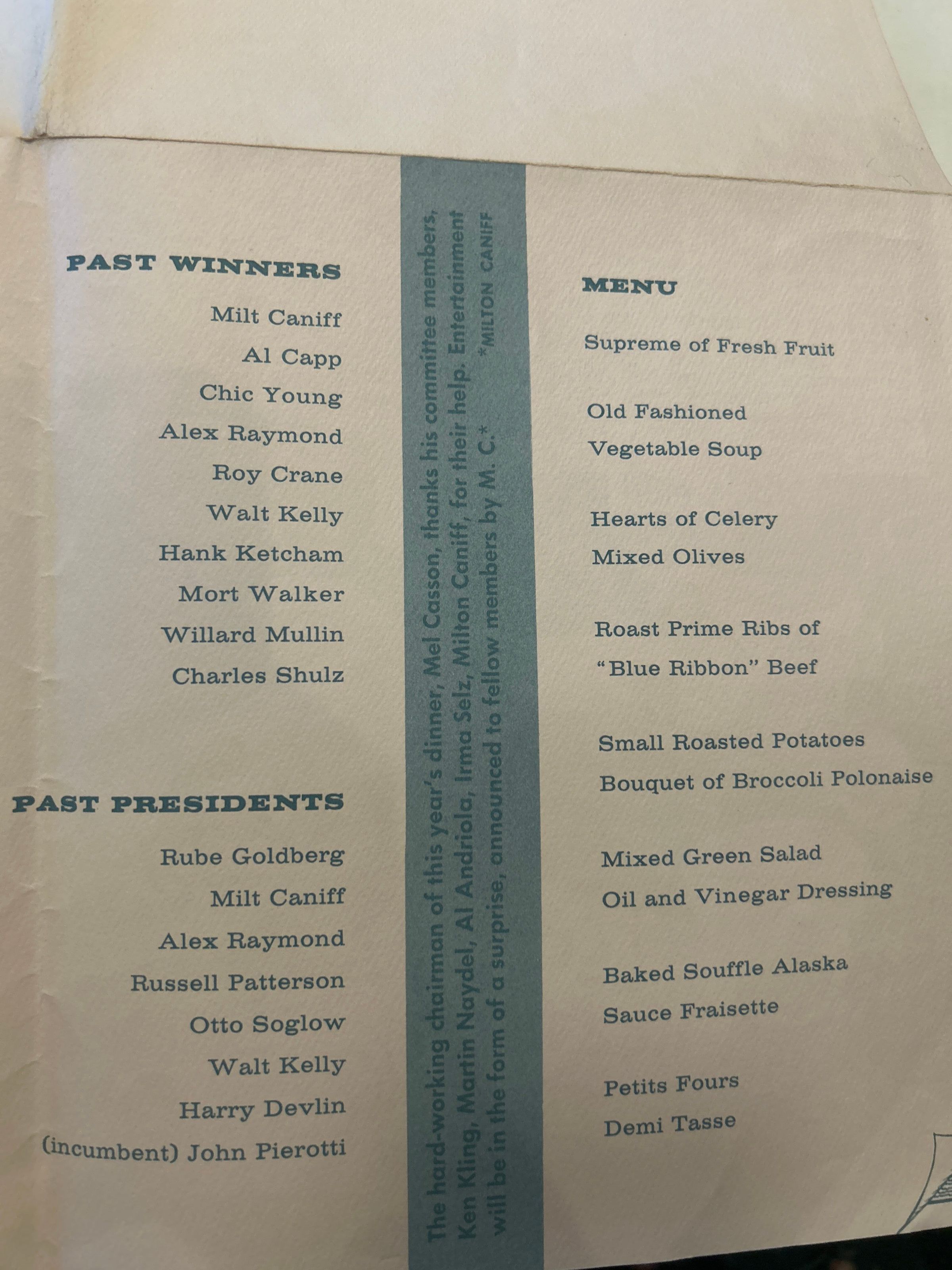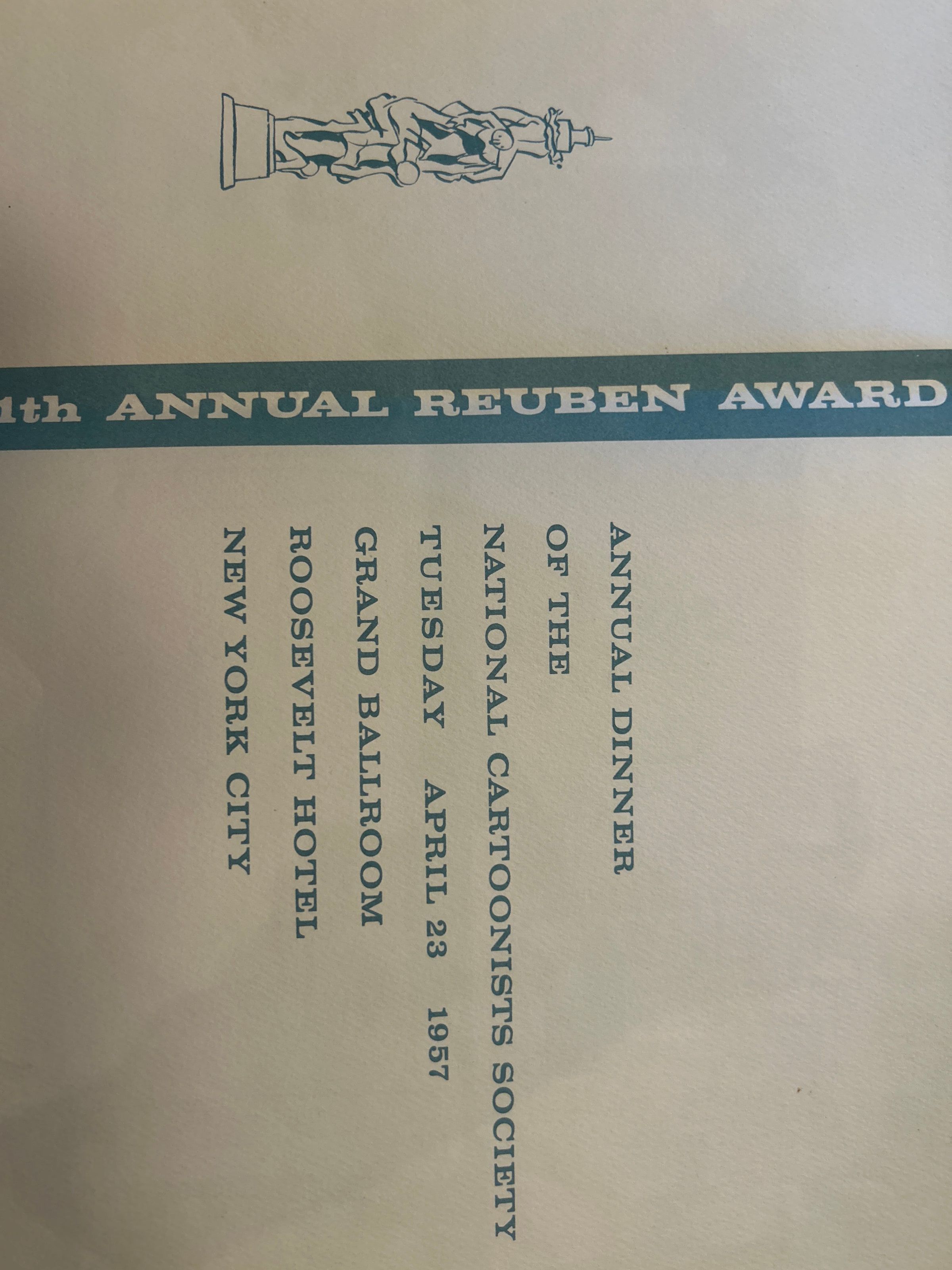 Program and menu from the National Cartoonists Society Dinner, Tuesday, April 23, 1957 at the Grand Ballroom of the Roosevelt Hotel, New York City.Acquisition
