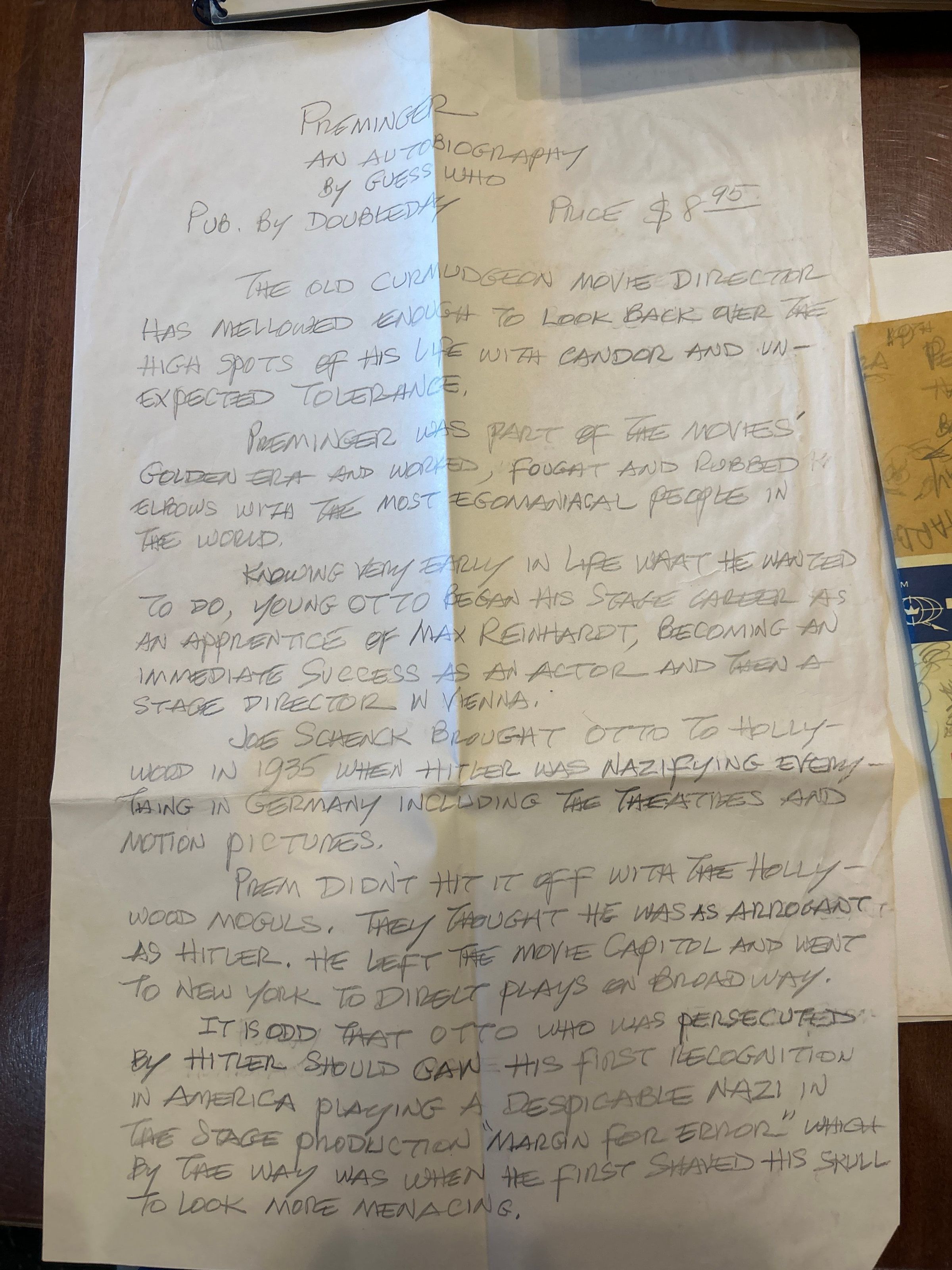 Humorous description of a hypothetical biography of Otto Preminger written by Bob Dunn.Collection