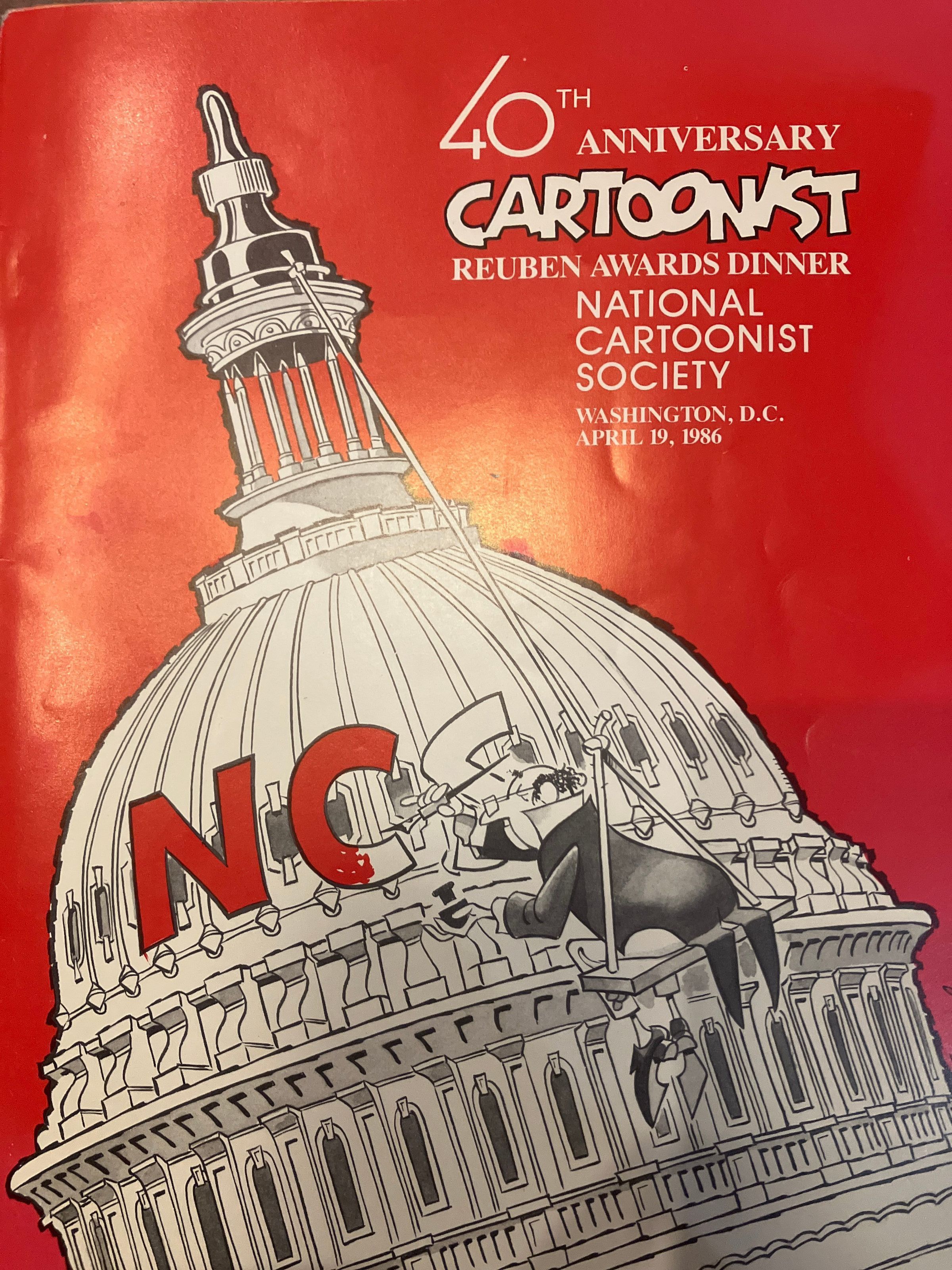 Program from the 40th Anniversary of the Cartoonist Reuben Awards Dinner from the National Cartoonist Society, Washington, D.C., April 19, 1986. 52 pp., unpaginated. Illustrated with B&W photographs, drawings and cartoons. Article by Bob Dunn, "Three Strikes You're Out at the Old Ball Game!"Collection