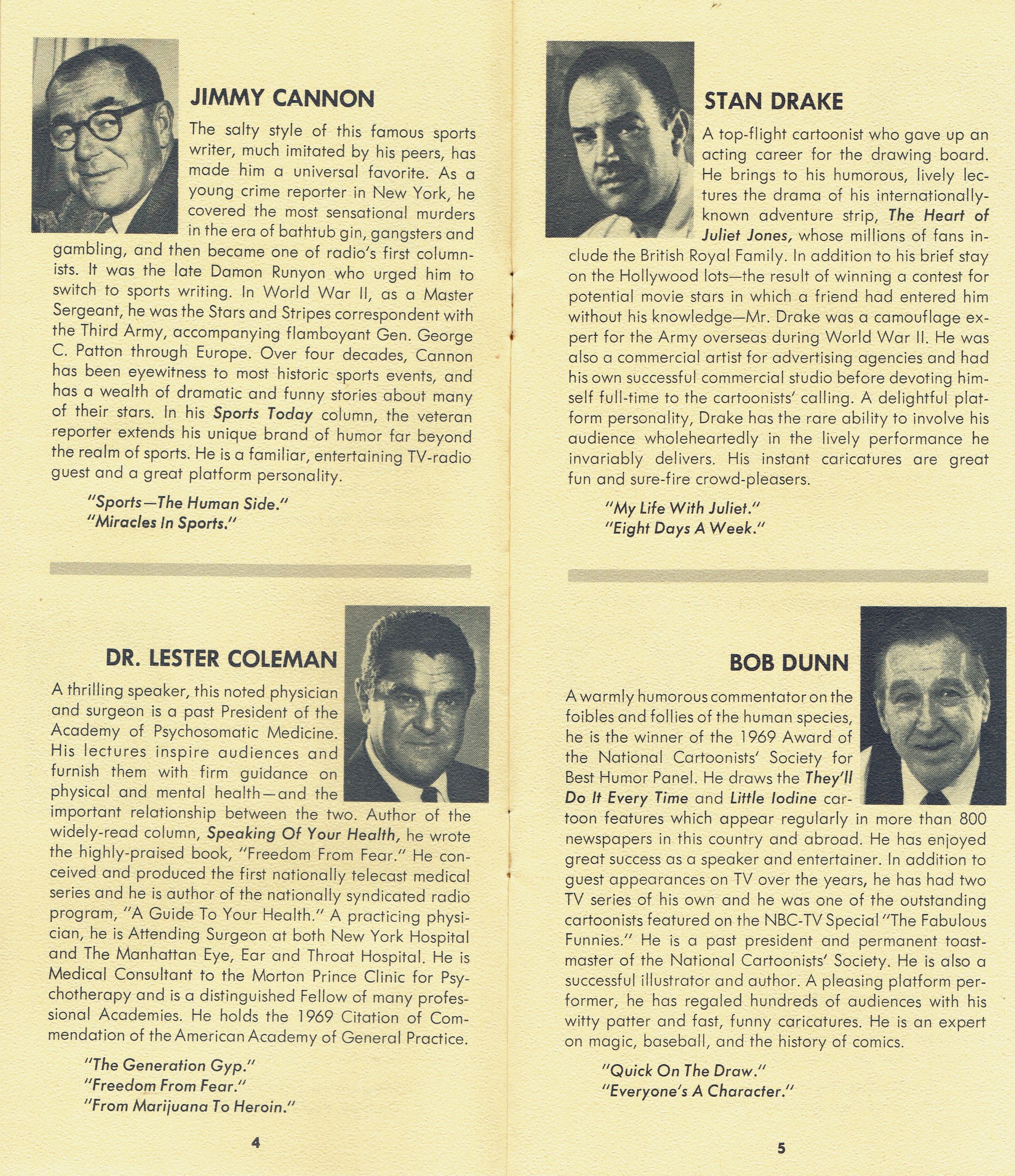 Program of artists in the King Lecture Bureau in 1970-1971, who were available to speak at events. 11 pp. Illustrated with photographs of individuals. Included are: Dan Barry, Jim Bishop, Milton Caniff, Jimmy Cannon, Dr. Lester Coleman, Stan Drake, Bob Dunn, Paul Frehm, Stu Hample, Dorothy Manners, Marianne Means, John P. Roche, Sam Shulsky, Mort Walker, Dik Browne, Emily Wilkens and Jack Wohl. Contains insert stating that on the 24th Annual Awards Dinner for the National Cartoonists Society, Bob Dunn won the award for the best panel cartoon of the year.Collection