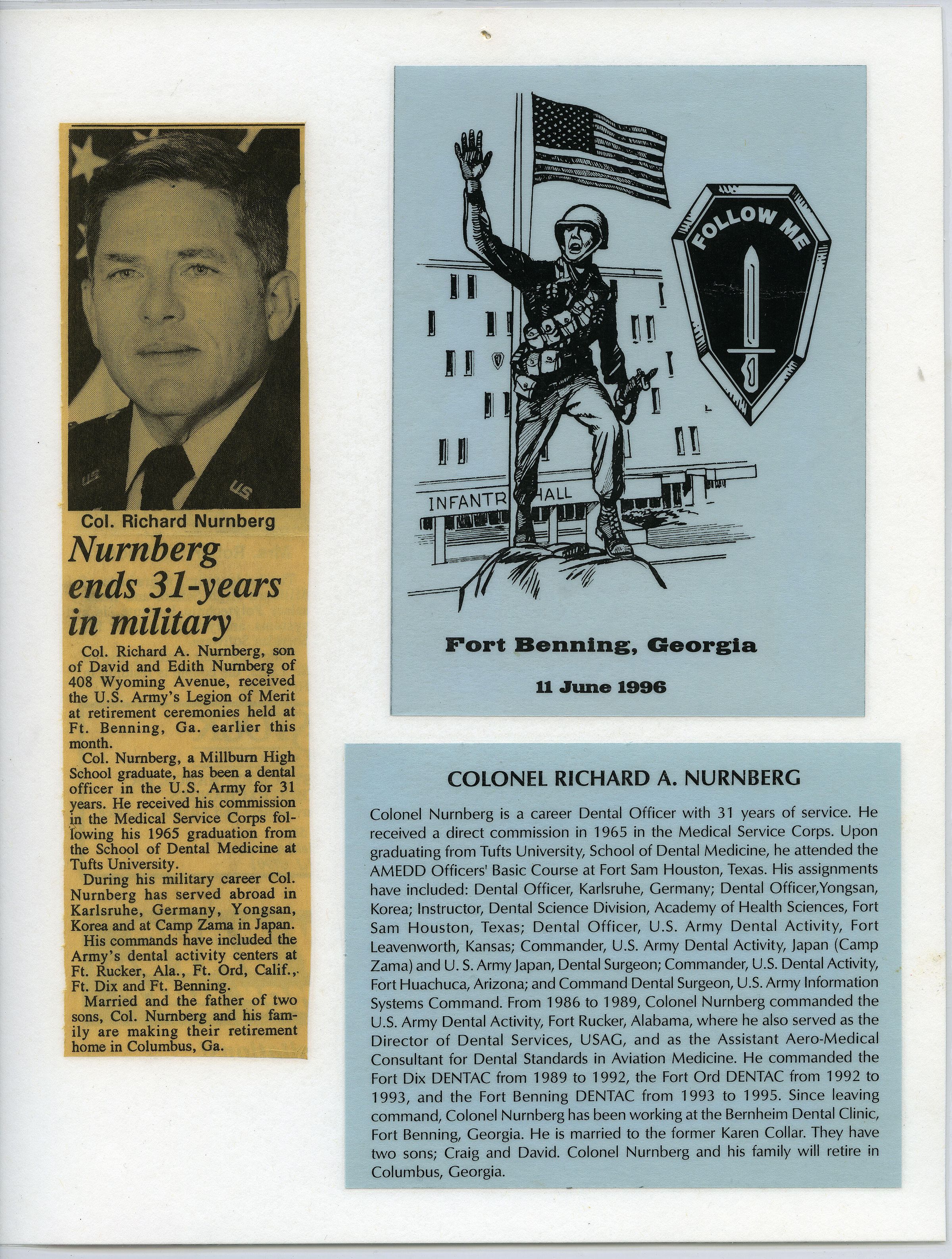 Colonel Richard A. Nurnberg graduated from Millburn High School in 1959. In 1965 he began his 31 year military career in the Medical Service Corps., as a dentist. After serving as US Commander of Dental Activity for the US Army in Japan for three years, he returned to the United States and continued to serve at various military bases. Colonel Nurnberg conducted an oral history interview about his service in the US Armed Forces, which is available online through the Library of Congress.Acquisition