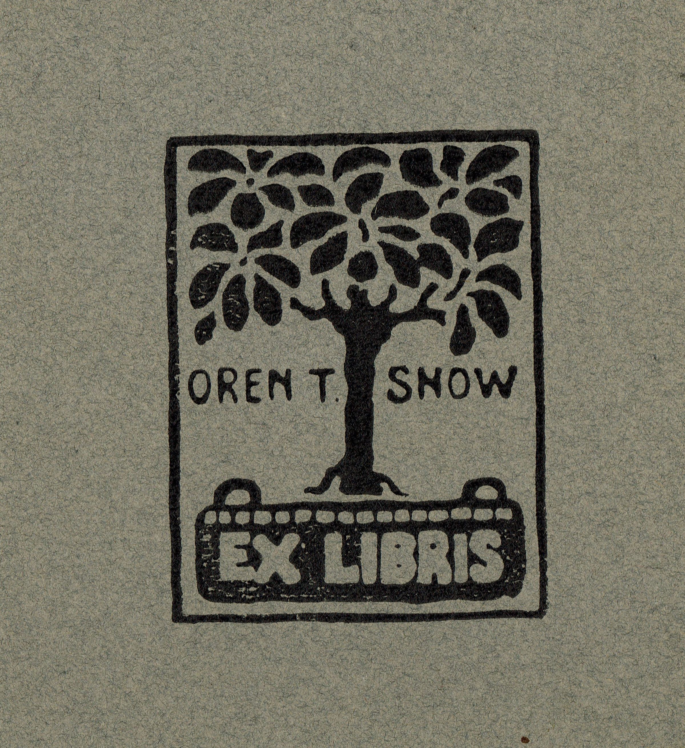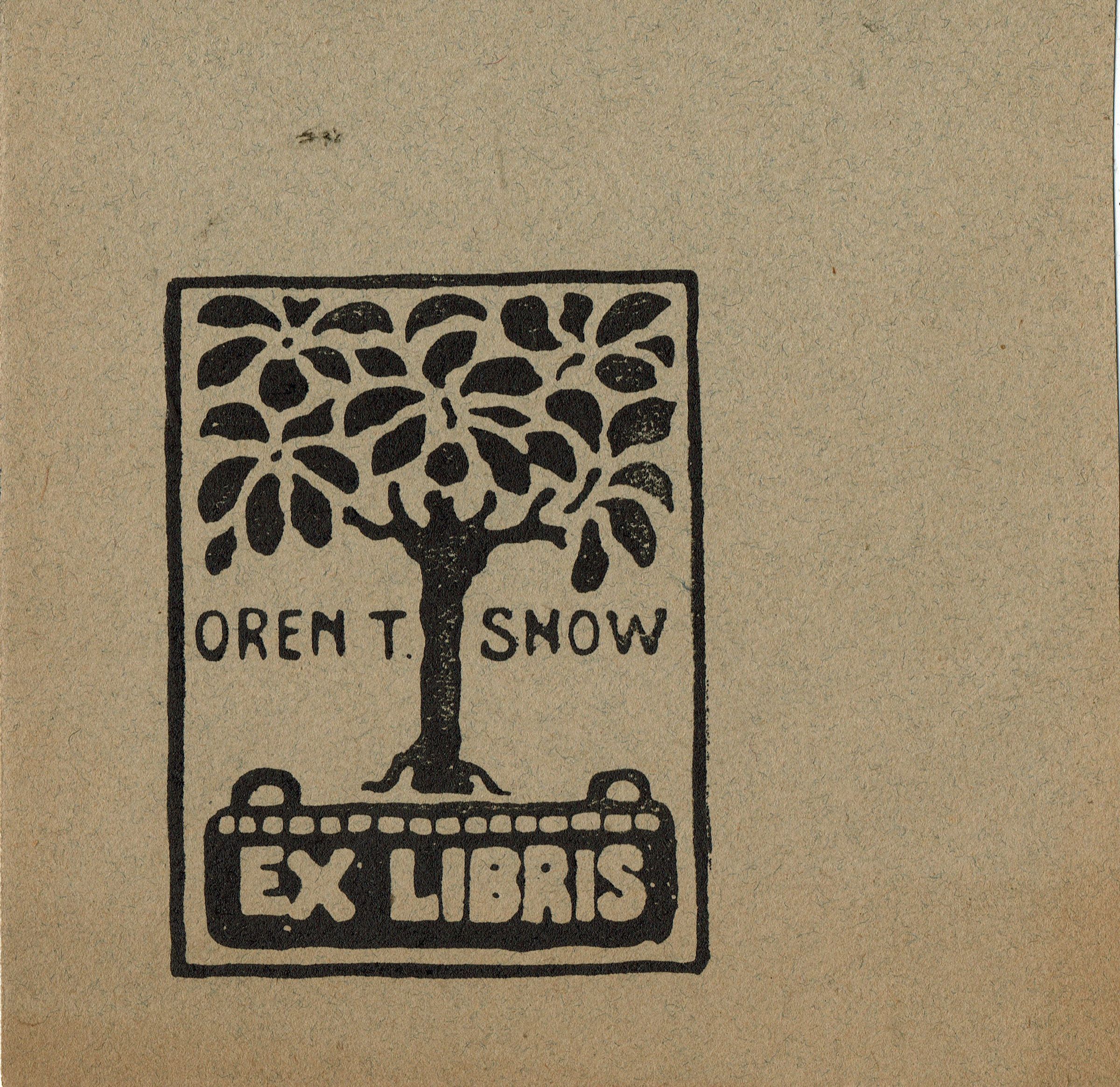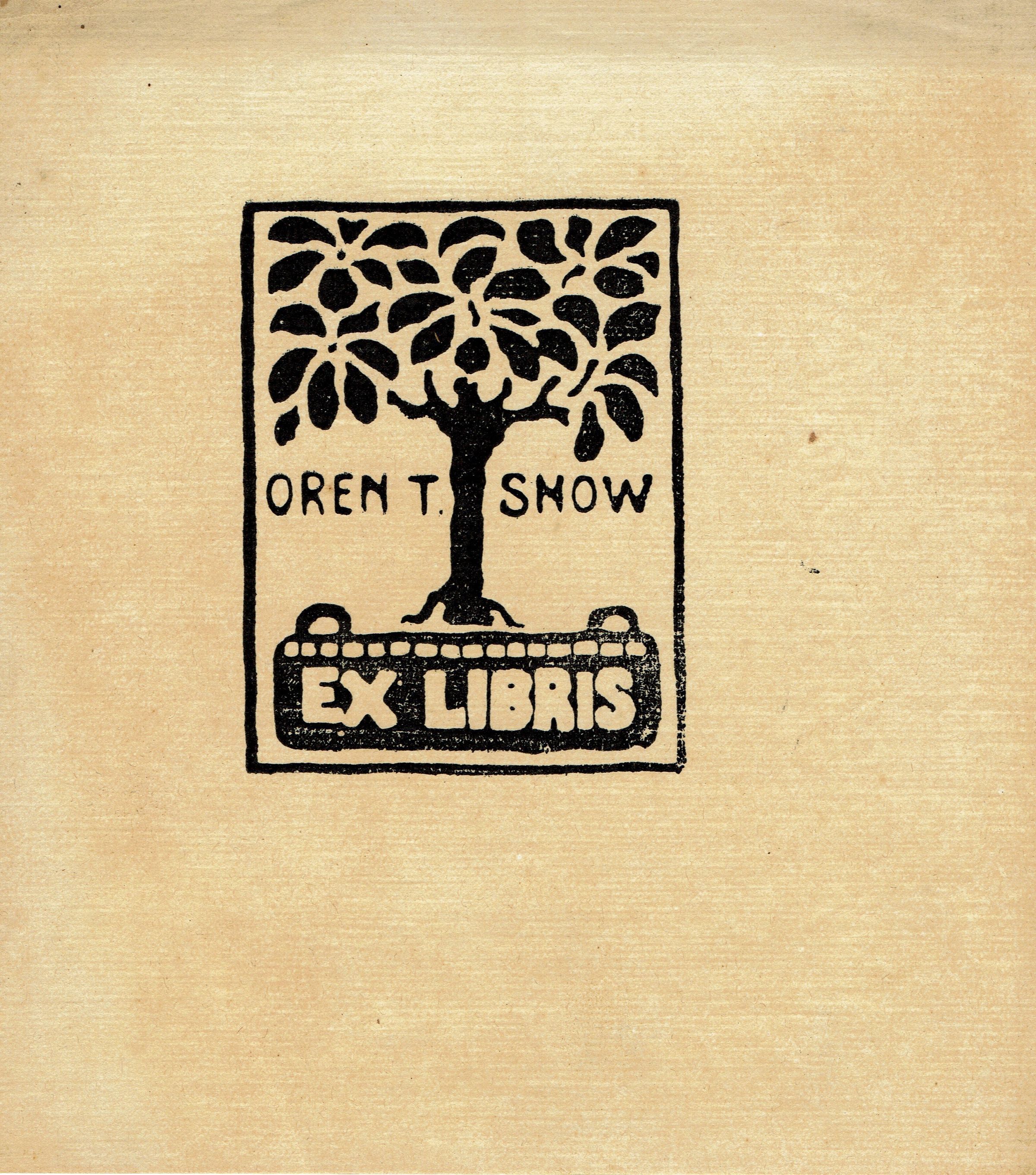 Woodblock print book plate design for Oren T. Snow by Bonnie Snow. Printed on gray, cream and tan paper.Collection