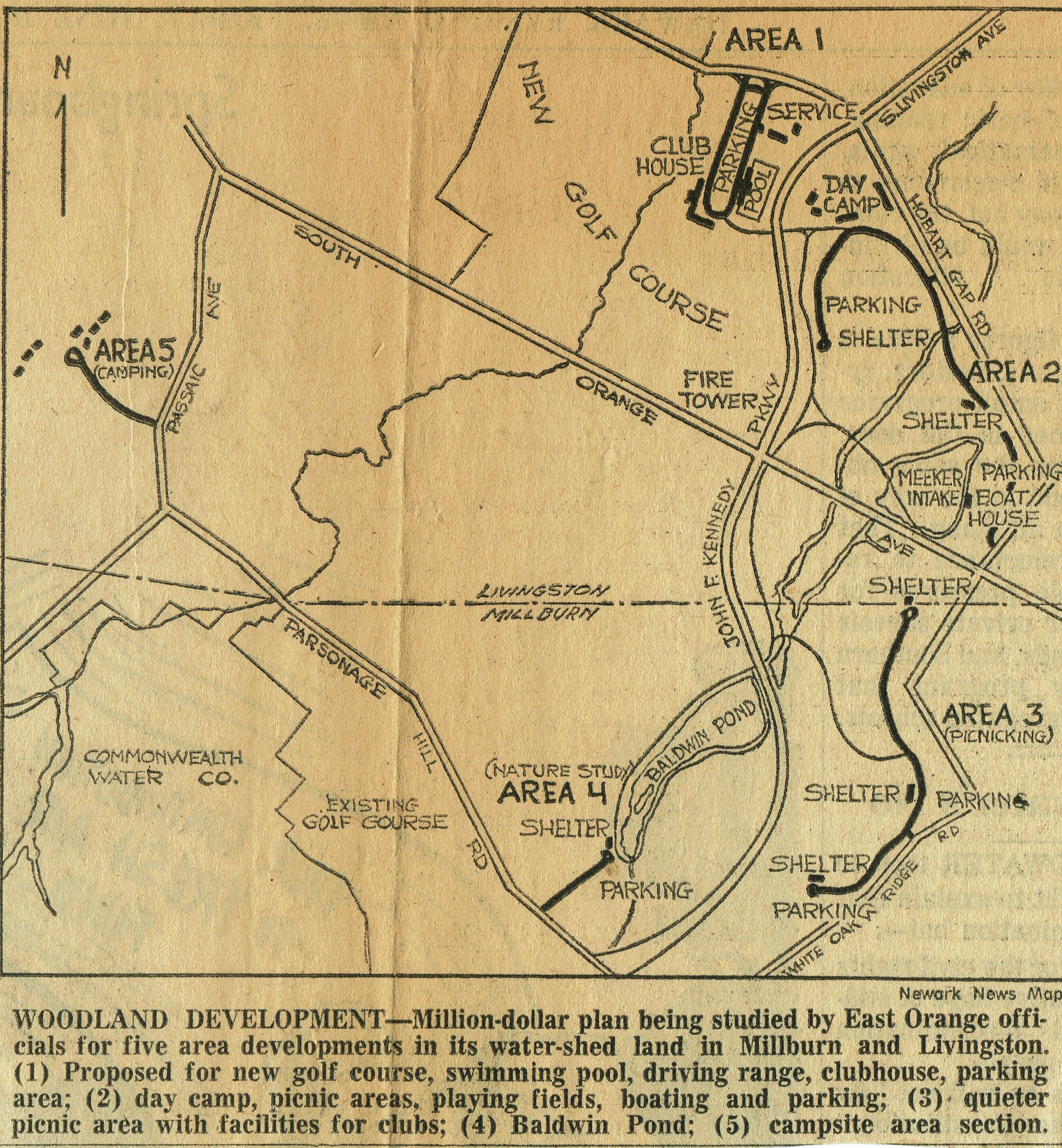 Article in the June 19, 1964 Newark Evening News describing projected plans for a Recreation Project on the East Orange Watershed land adjacent to the East Orange Golf Club in Millburn. The plan was not realized.Acquisition