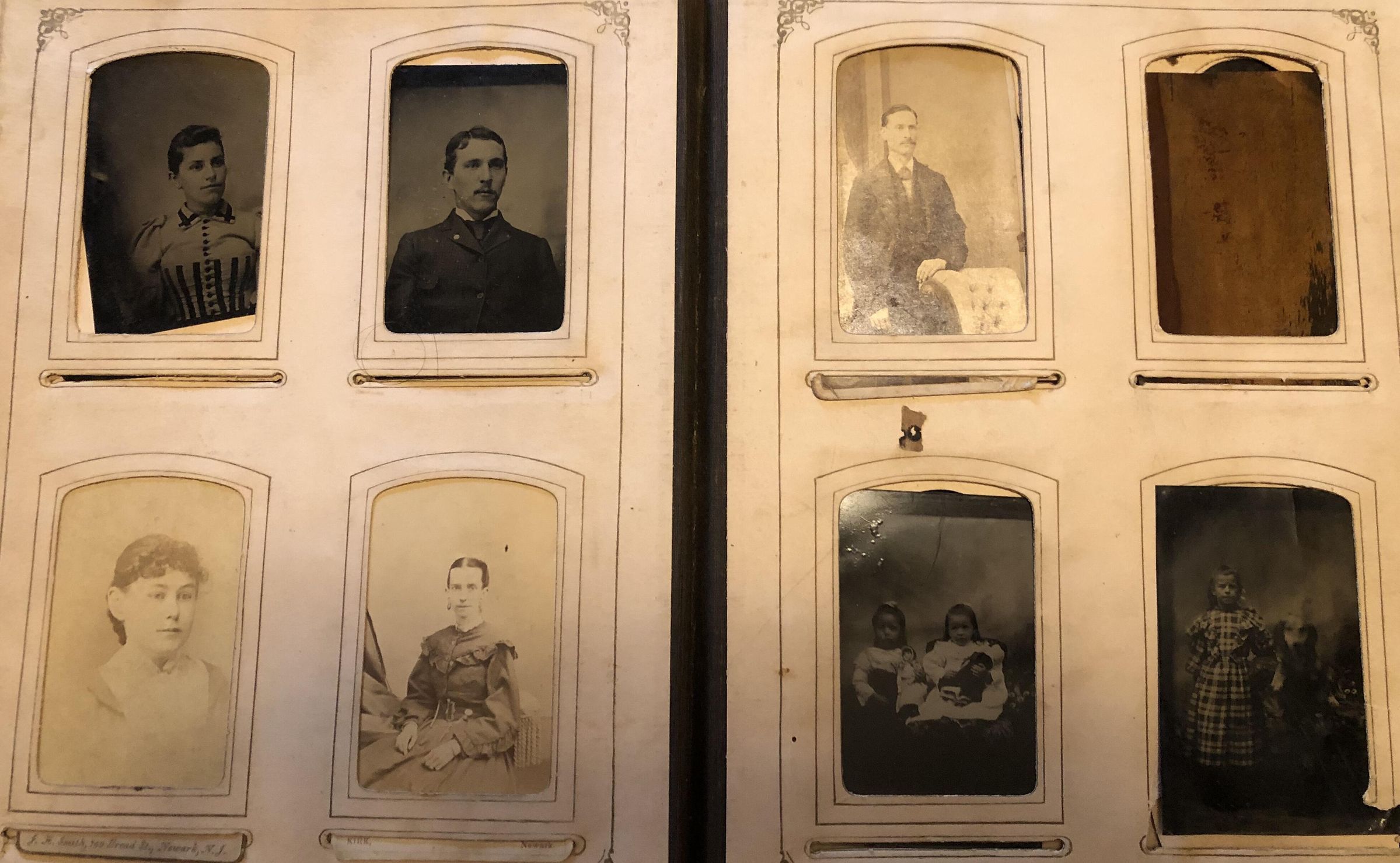 Baby Photo (taken by Edsall Company, 248 W 125th Street NY), photo of house with 3 women and a child, photo of sitting woman ( Name WM L Taylor on the back), photo of 4 men sitting around one man, photo of sitting man, group photo, photo of parents, 3 children and man, photo of one woman in front of stairwell, photo of mother and father with daughter, photo of Black mother with 2 children, group photo, photo of mother and daughter, photo of man, group photo, photo of couple, photo of standing woman, sitting child, photo of man, 3 photos of women, photo of baby (Mrs. EG Lacey's photo studio in Morristown and NY Cash store), photo of man taken by EG Lacey, 2 photos of women, group photo of men, group family photo, photo of woman, photo of man, photo of woman (taken by J Henry Smith, 769 Broad Str), photo of AIlalisia I Ellis (taken by Joseph Kirk, 661 Broad Street in 1870), 2 girls with dolls, 1 standing man, girl with dog, seated baby, standing man, seated woman, standing woman, standing man, photo of man, photo man, 2 cigarettes card for Honest Longcut cigarettes manufactured by W Duke Sons and Co, group photo, photo of sitting woman, standing child, 2 men sitting, group photo, sitting man, child, standing girl, group photo, 2 men with child,, sitting woman, standing child, photo of man (Johnson's, 809 Penna Avenue in Washington DC), 2 women, mother and daughter, sitting girl (Taken by D.E), photo of man, photo of woman, woman and child, photo of man, standing man, (taken by Charles Deforest Fredricks, 770 Broadway), photo of womanPhotograph Details