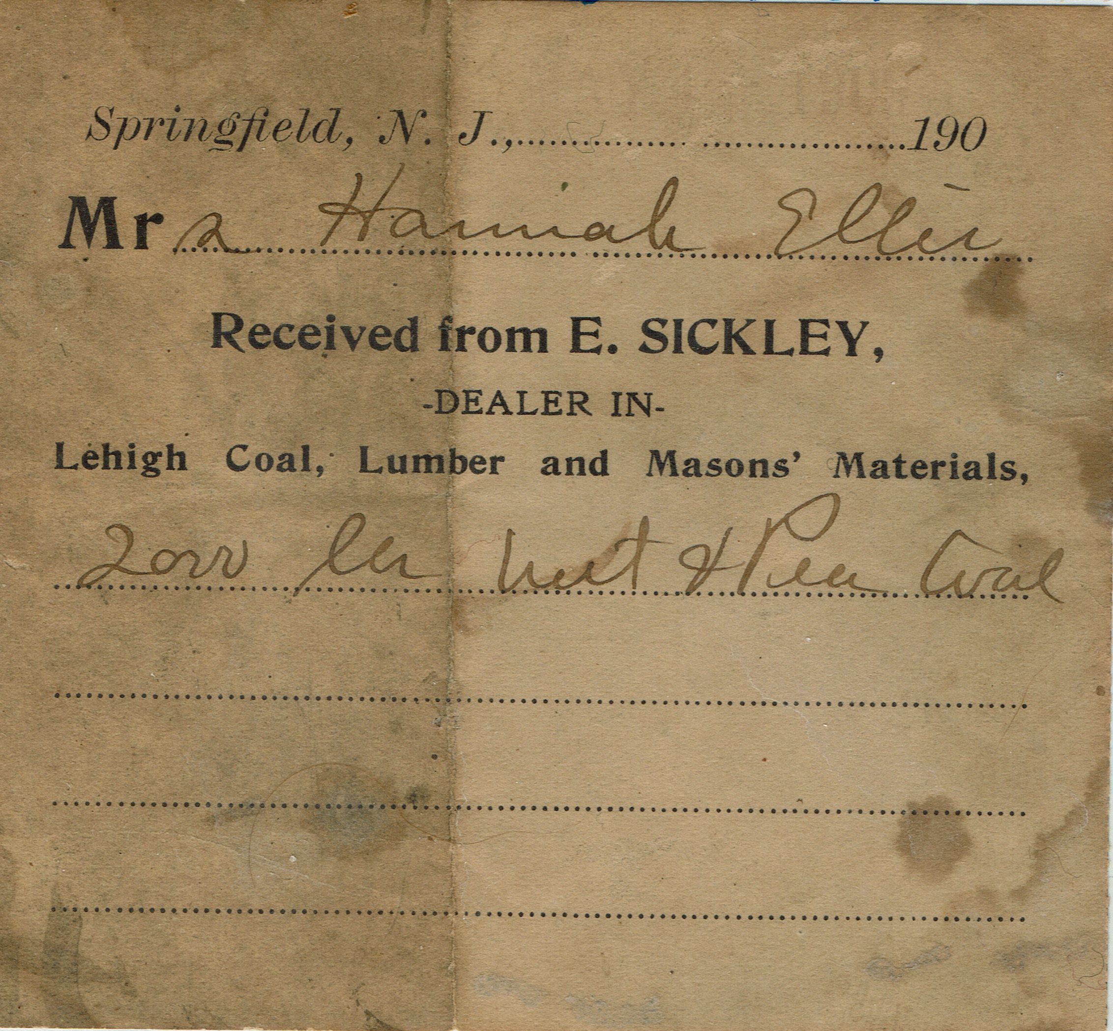 Receipt from E. Sickly, dealer in Lehigh Coal, Lumber and Masons' Materials, Springfield to Mrs. Hannah Ellis for coal from 190 (?)Collection