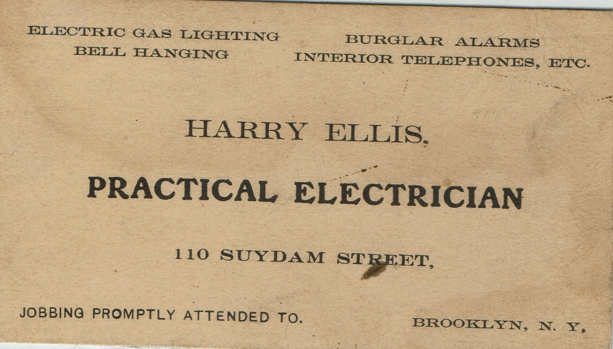Ellis Family Business cards. Harry Ellis, Electrician, 110 Suydam Street, Brooklyn; Walter E. Ellis, 115 Suydam Street, Brooklyn.Collection