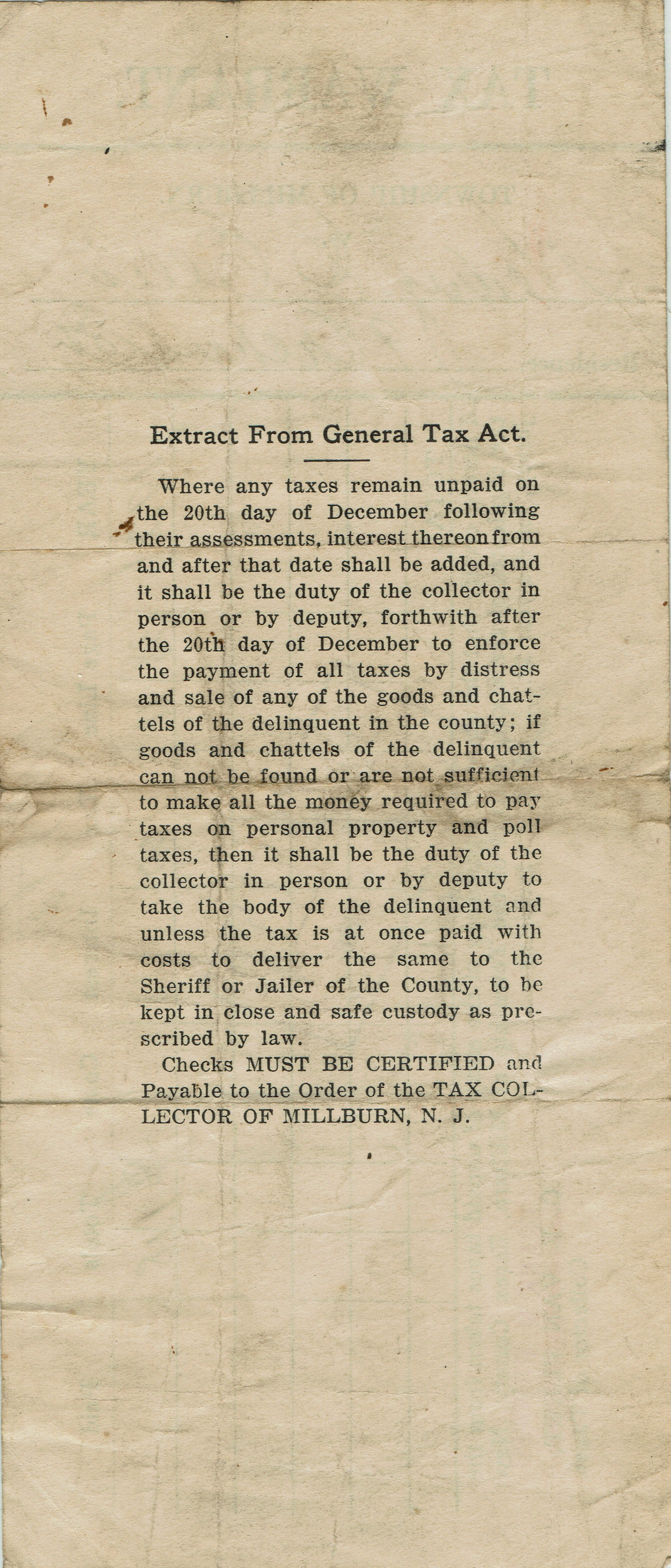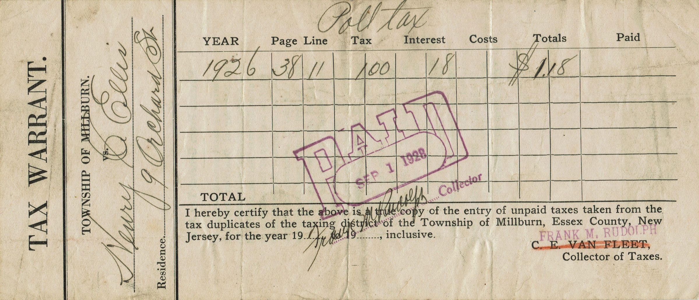 Receipt for payment for the Township of Millburn Poll Tax, 1926 issued to Henry C. Ellis, 9 Orchard Street, stamped paid September 1, 1928. Signed by Frank M. Rudolph, Collector of Taxes.Collection