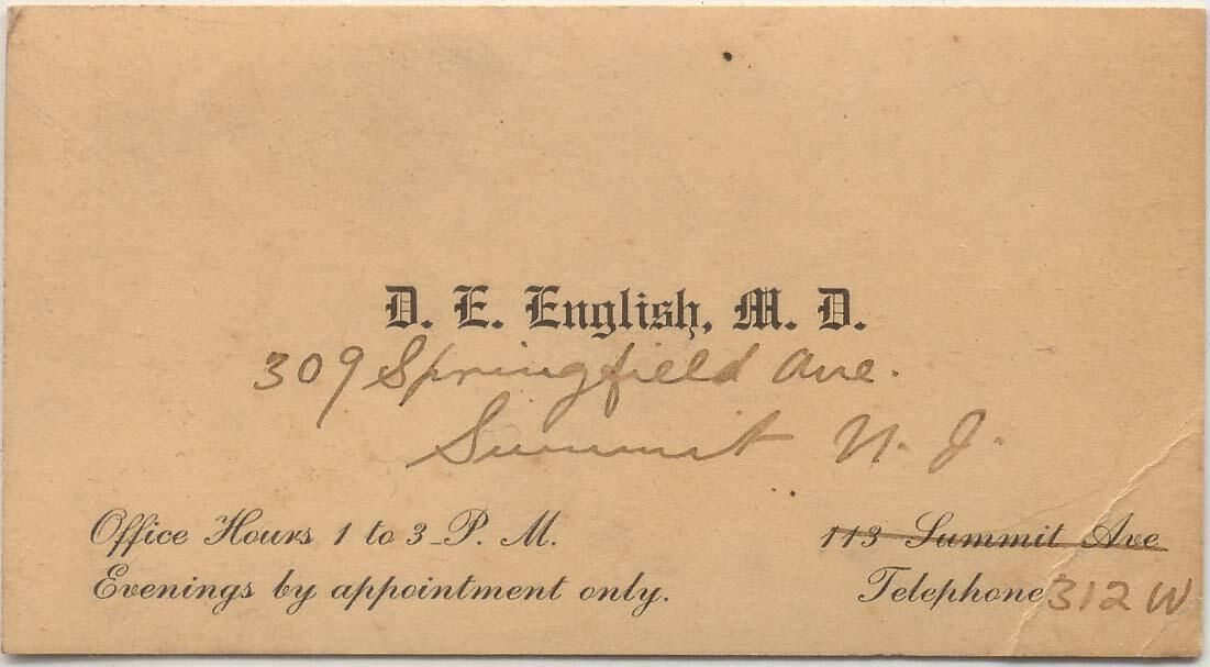 Dr. David Eugene English (c. 1857-1929)was born c. 1857 at Liberty Corner, Bernard Twp., Somerset County, NJ. He was the son of Reverend James Theodore English and Mary Elizabeth Jobs. David married Margaret Jane Caparn, daughter of Thomas John Caparn and Ann Elizabeth Price, c. 1891.