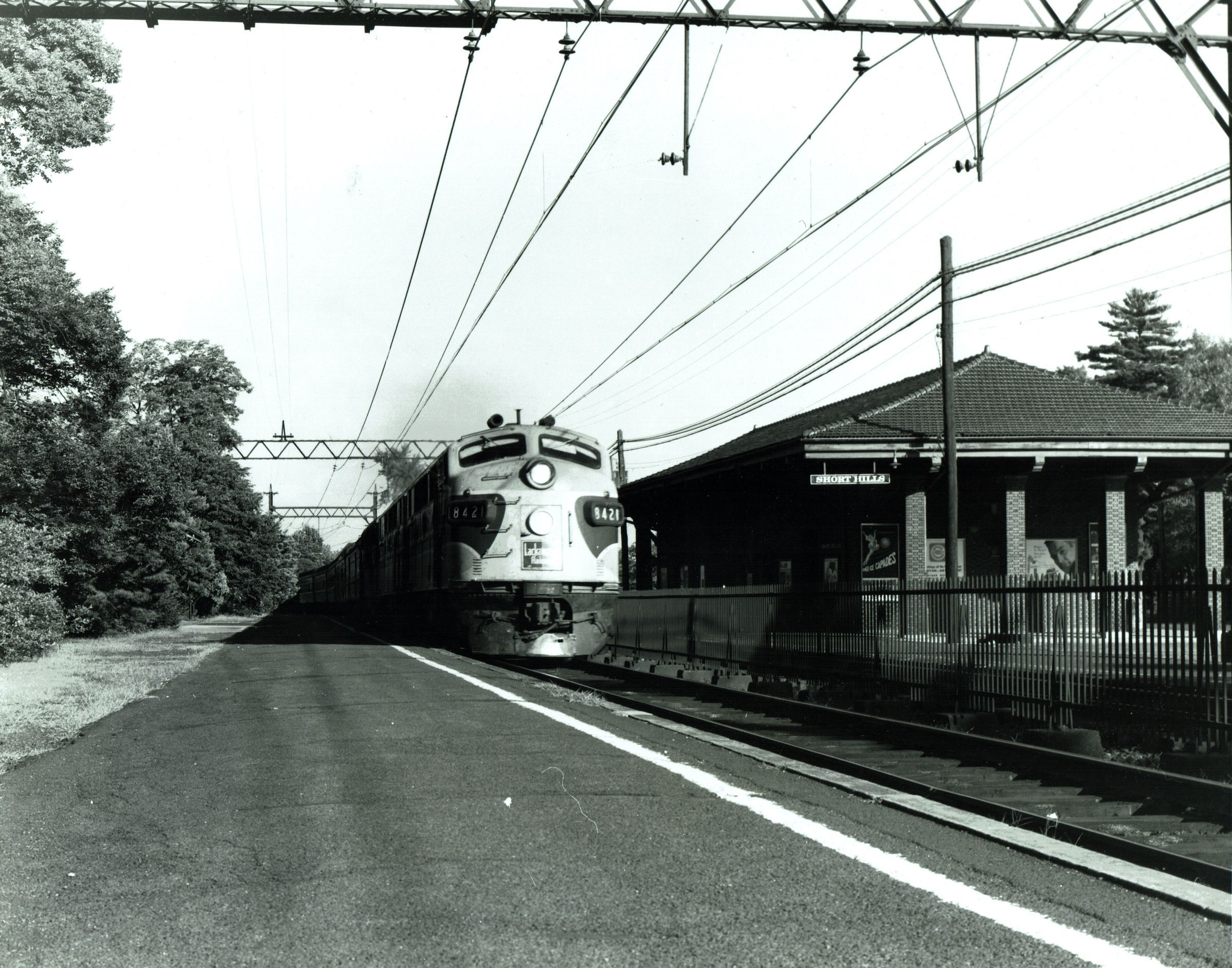 Photograph of Erie Lackawanna westbound passenger train at the Short Hills Train Station from the early 1960s. Distributed by Railroad Avenue Enterprises.