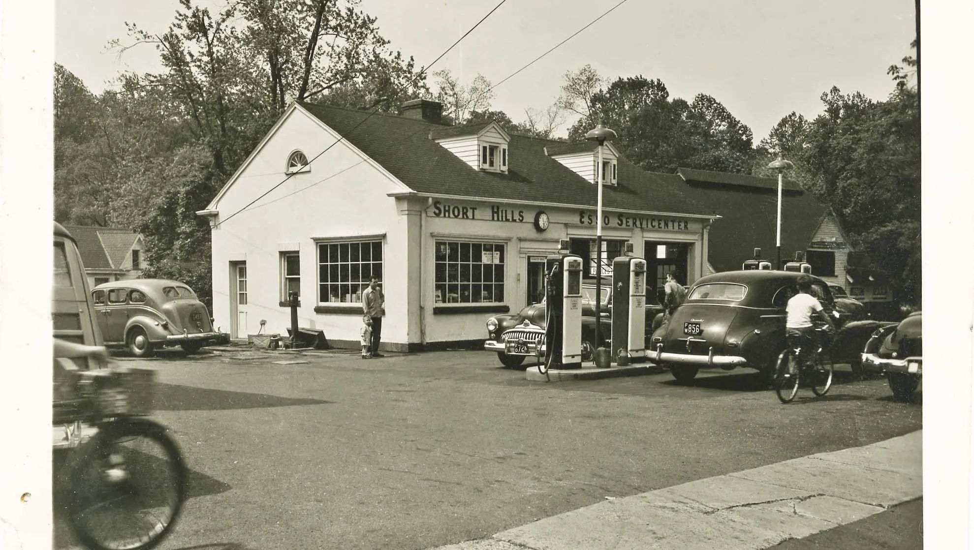 This early 1950s photo was loaned to the Millburn-Short Hills Historical Society from the collection of Tom Schaefer, a prior owner of the service station at Woodland and Chatham roads in Short Hills. Tom's grandfather bought the business from the original owner, a Mr. Wittkop, who owned all of the buildings in that section of Chatham Road. The business on that site is now Short Hills Fuel. What looks like an extension on the right of the existing/original building is apparently a building behind it, where the Woodland Road apartments are now. A sign in one of the windows in that building on the right side seems to say "FOOD."