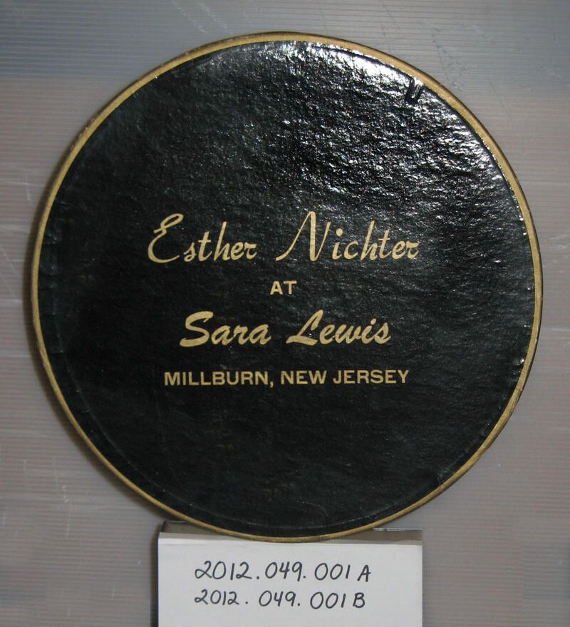 "Esther Nichter at Sara Lewis, Millburn, NJ" hat box. In the 1968 directory, Sara Lewis was recorded as a woman's dress shop at 51-53 Main Street, owned by Mrs. Sara Lewis, who lived in East Orange. In the 1940 US census, 27-year-old Esther Nichter was living in Newark with her husband William, who made hat blocks for women's hats. Box has a black, glossy bottom, and sides, as does the lid top. Side of lid has gold polka dots on white and a gold carrying cord goes through holes in the side of the box body. All edges show wear, as does the top, bottom, and sides. Approximately 8 small nicks in the box side are in a vertical line coming up from the bottom of the box. Approximately 8-10 small nicks are scattered around the sides of the box body. About 20-21, generally parallel, 1/8"-1/4" long linear nicks/tears in the black coating circling the bottom of the box. The lid has about 4 linear smudges, primarily around the name. Purchased on eBay from: Ann Mooney; 134 Jefferson St; Brookville PA 15825Acquisition