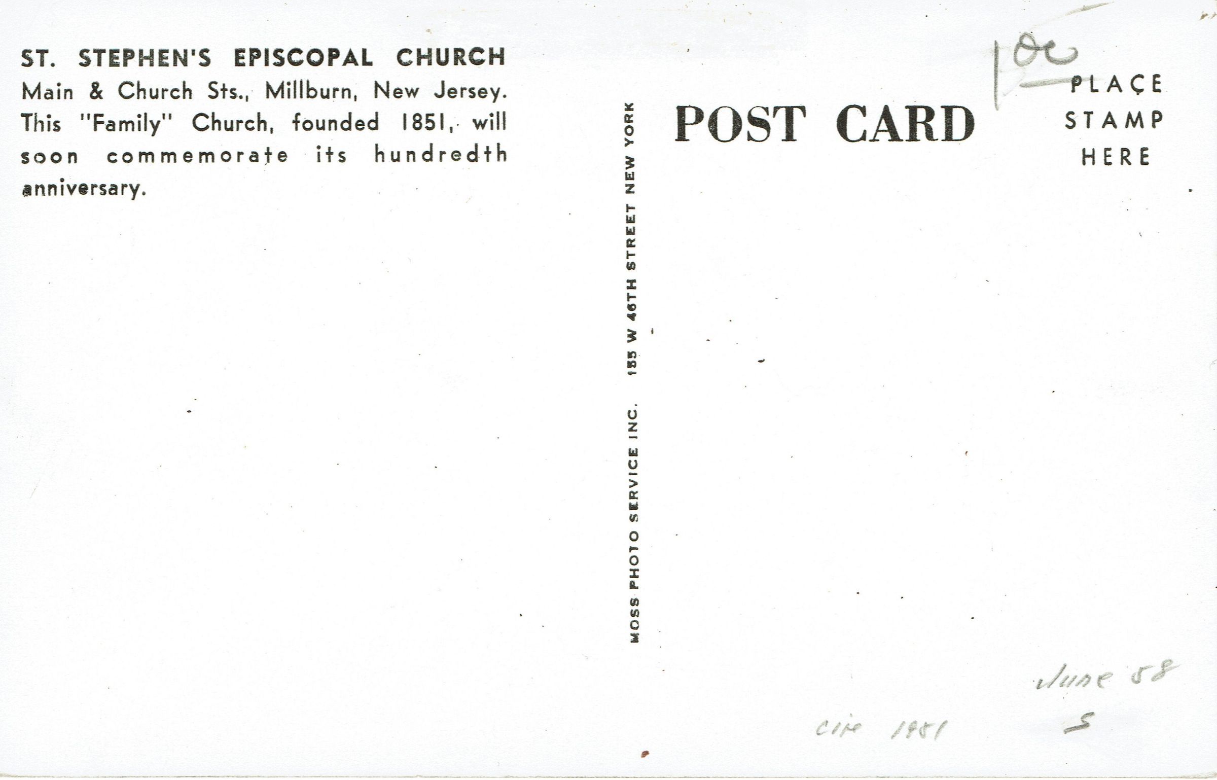 Photographic postcard showing details from St. Stephen's Episcopal Church, Main Street, Millburn, NJ, c. 1950. The postcard commemorates the 100th Anniversary of the founding of the church. Postally unused. Caption on verso of postcard reads: "St. Stephen's Episcopal Church, Main & Church Sts., Millburn, New Jersey. This 'Family' Church, founded in 1851, will soon commemorate its hundredth anniversary.Collection