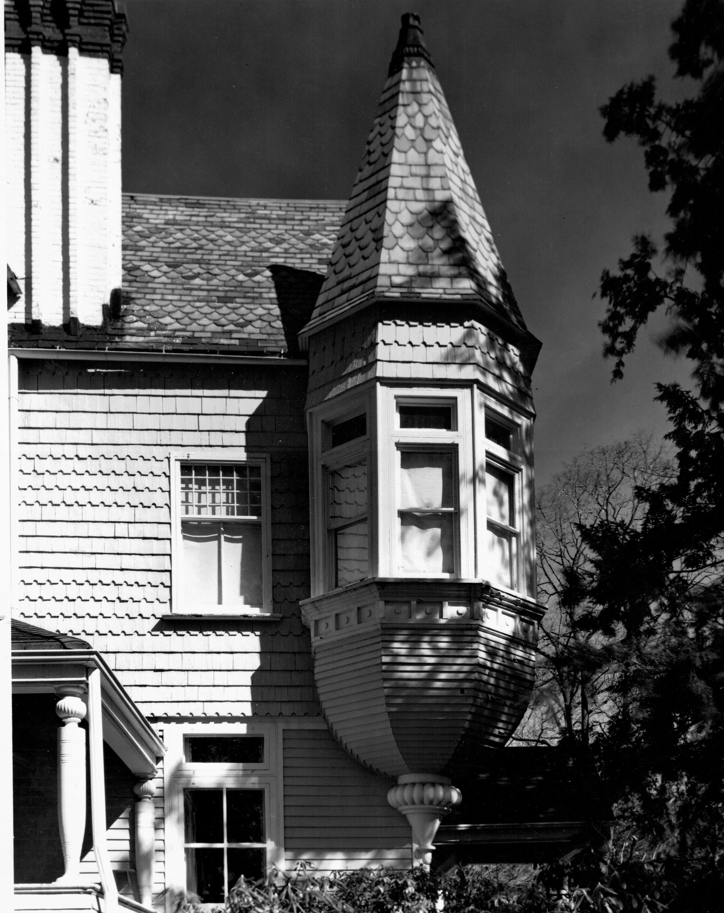 Lamb & Wheeler, House for Stewart Hartshorn, ((Gouverneur K. Haswell House), Knollwood Road, Short Hills, N.J., 1879, L.&W. Oriel with conical roof of patterned slate shingles repeats the patterned shingles of the wood siding. The melon shape at the bottom of the oriel is reflected in the melon shaped capitals of the Jacobean columns.Collection