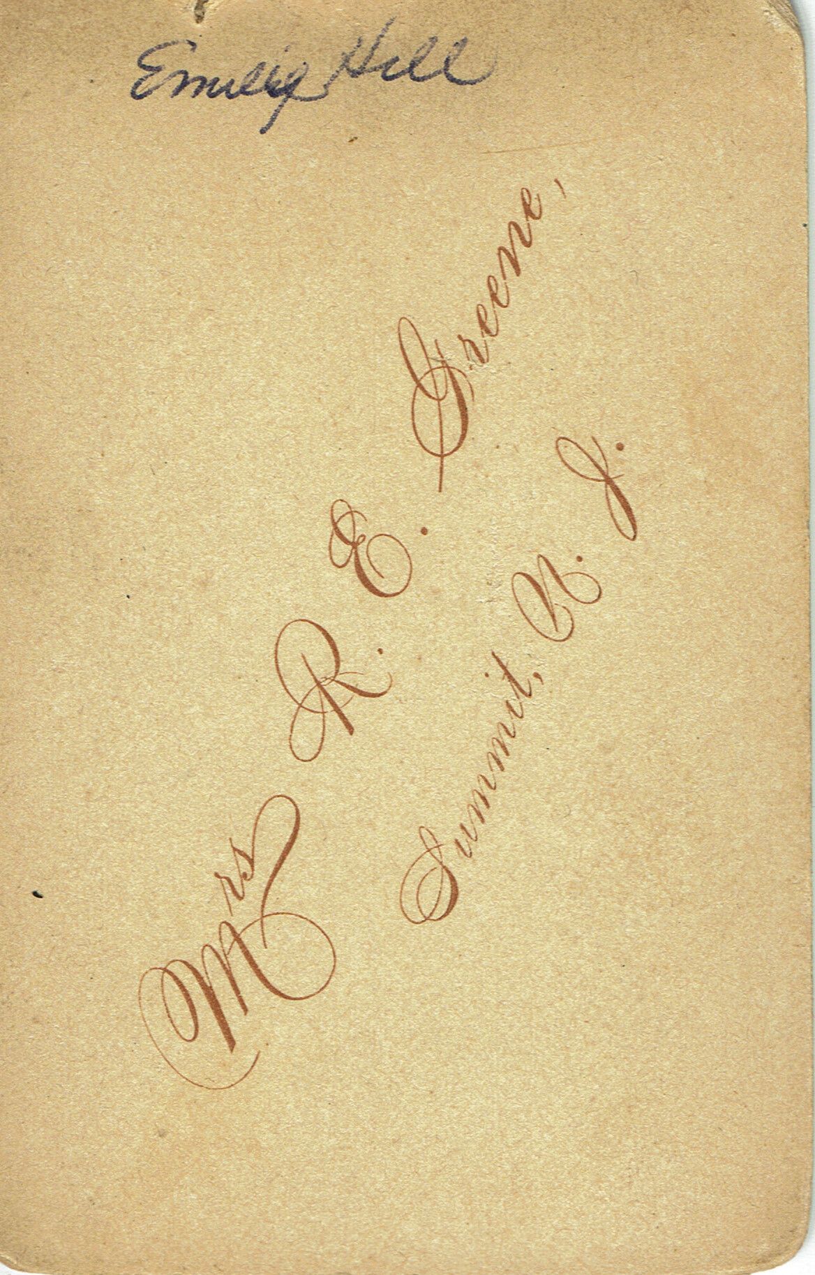 Photograph from the Blood Family Collection identified as Emilie Hill. Emilie Hill graduated from Millburn High School in 1902, along with Florence McCaskie and Juliet Blood. A photo of Emilie Hill with Juliet and Marianne Blood is in the Kellogg collection. According to Bessie Kellogg's notes, Emilie was 14 when the photograph was taken.