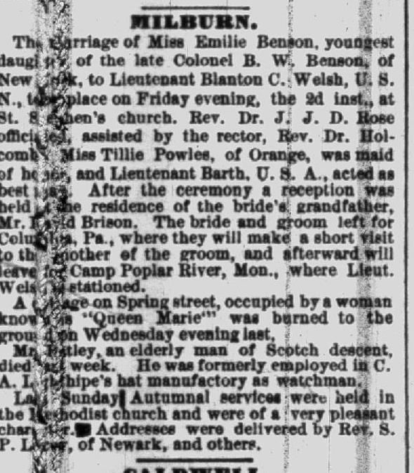Emilie Benson Welsh, wife of Lt. Blanton C. Welsh, 15th U.S.Infantry in her wedding gown. Married October 2, 1885 in Episcopal Church, Millburn, NJ by Rev. Julius D. Rose D.D. L.L. D. Their daughter Emilie was married in the same gown--white ivory satin brocaded front to Lt. Paul Felton Wiggin Air (?) Service (A.E.F. World War). The gown had to be enlarged in sleeves and bodice, used lining of (??) as was of same material as gown.Photograph Details