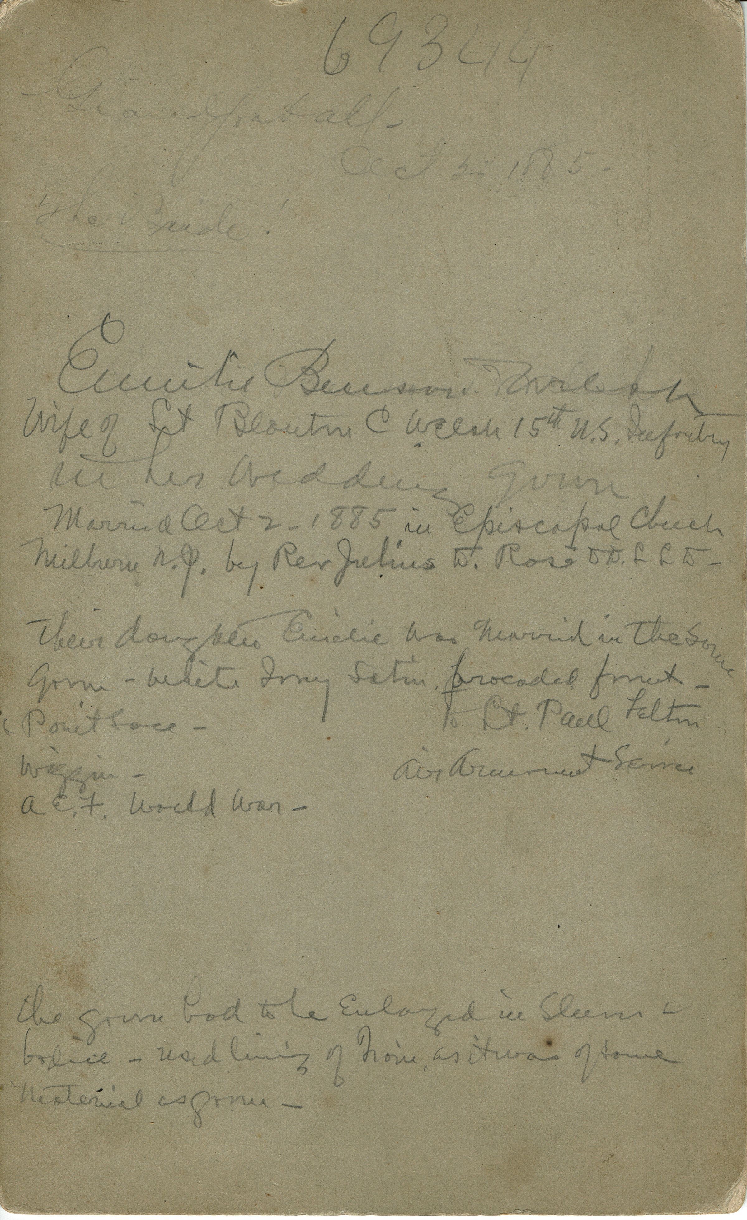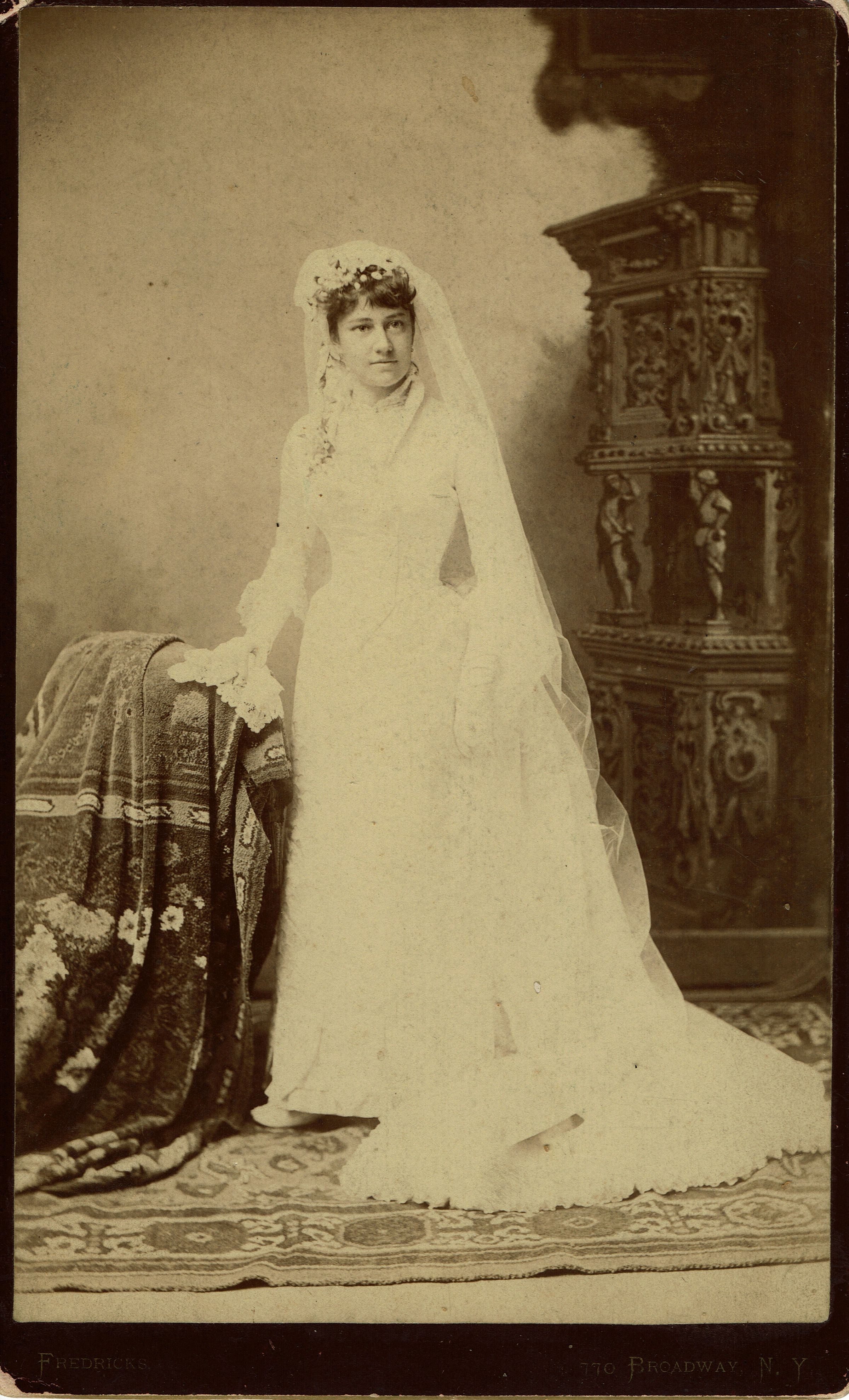 Studio photograph of Emilie Benson Welsh in her Wedding Gown taken by Frederick's Photography Studio, Broadway, New York City. Inscription on verso of photograph reads: "Glad for it all"(?) October 2, 1885 by the Bride.
