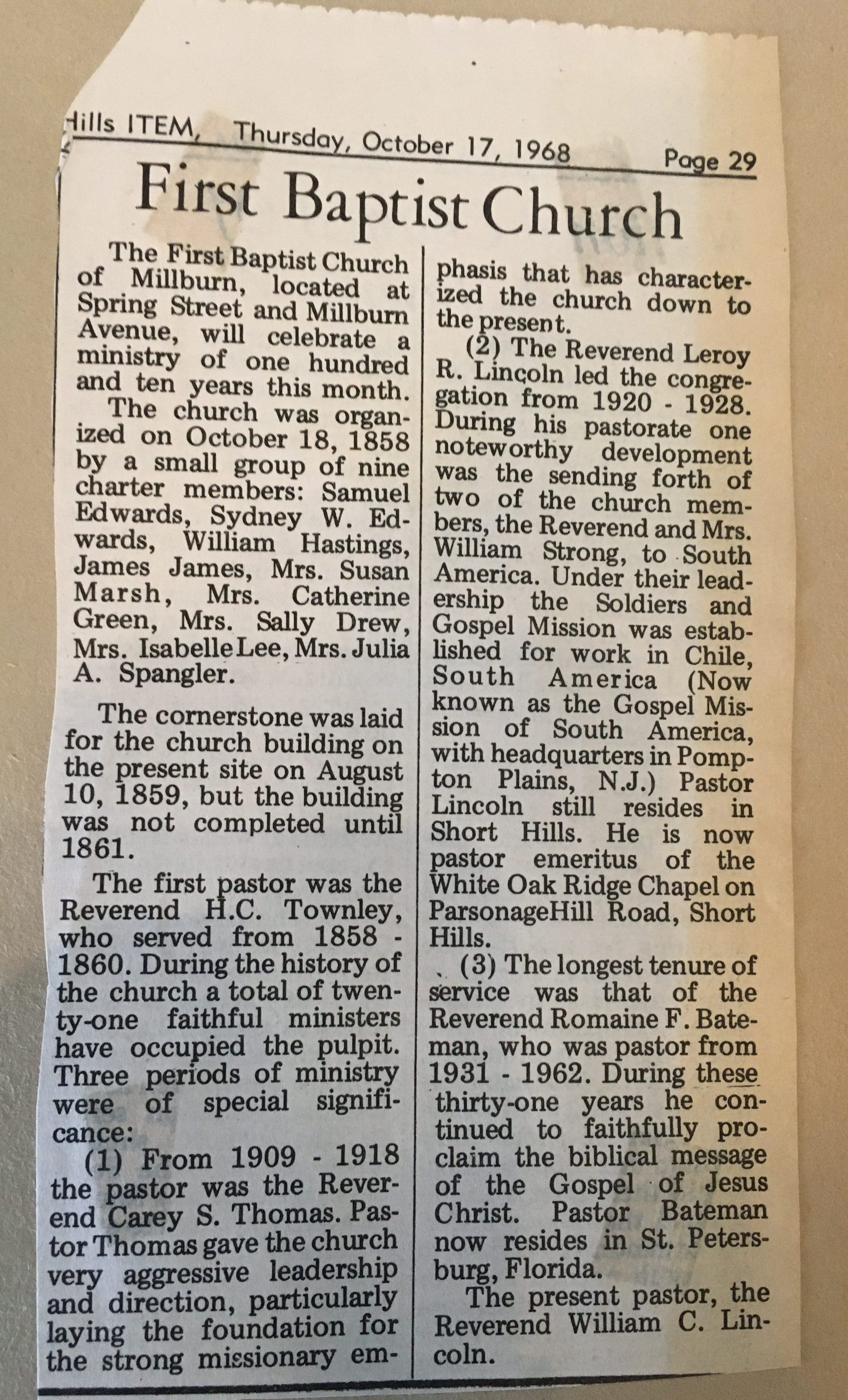 Newspaper clipping of "First Baptist Church" article from the Millburn & Short Hills ITEM, written on October 17, 1968 documenting the history of the church on the occasion of its 110th anniversary.Dimensions