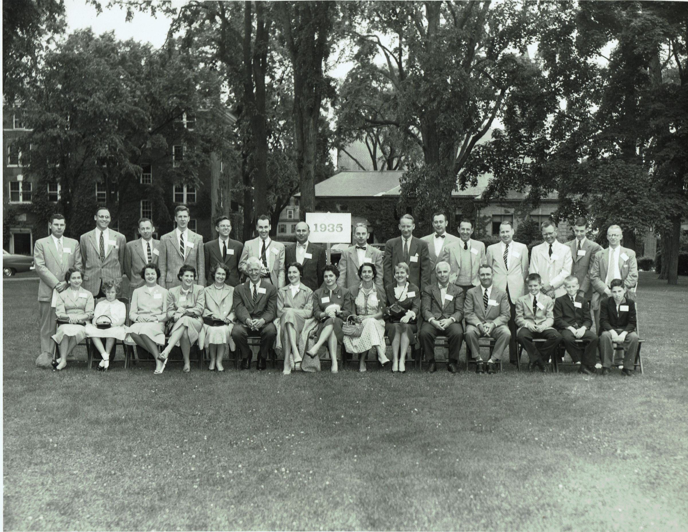 Photograph of Stewart Hartshorn, Jr. (send to the right of the 1935 sign) from the Exeter 20 year reunion in June 1955. Stewart Henry Hartshorn, Jr.'s grandfather was Stewart Hartshorn, inventor of the roller shade.Collection